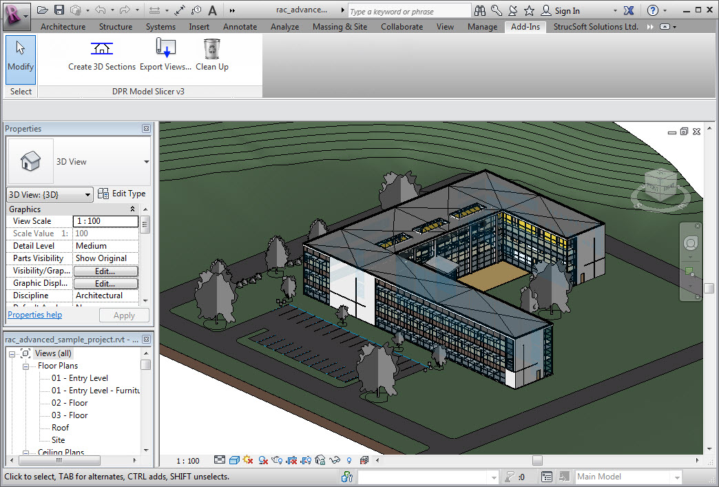 Confirm by creating a new "Default 3D View" and look at the "View Template" under "Identity Data" in the properites panel of the new view you just created. If correct you are set to use the DPR Model Slicer plug in.