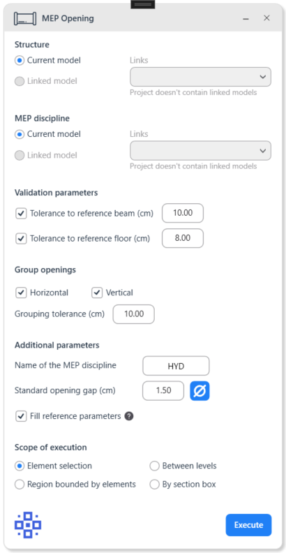 - Choose between the current or linked model for both the structural model (RVT or IFC) and MEP discipline (RVT).