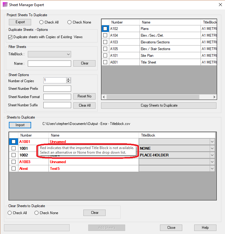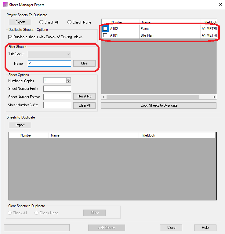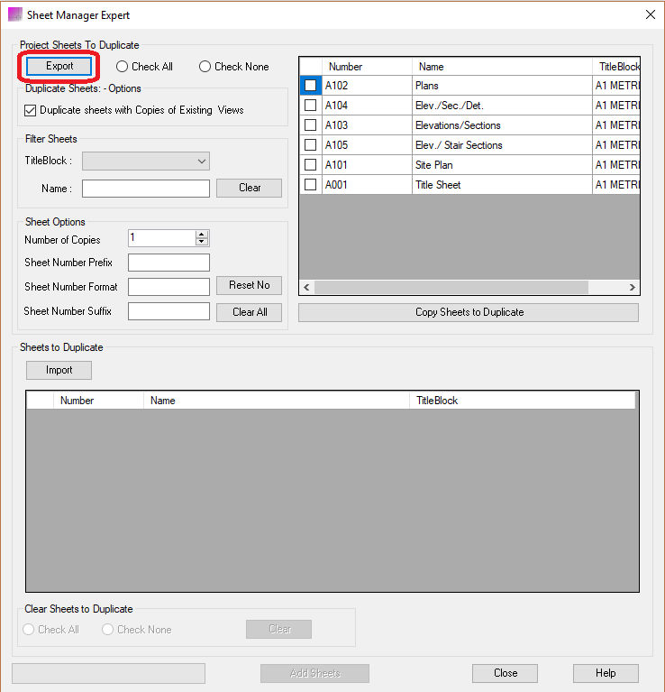 Export existing project sheet number, title and template type to create office standard csv file. Import sheet list csv file to create multiple sheets.