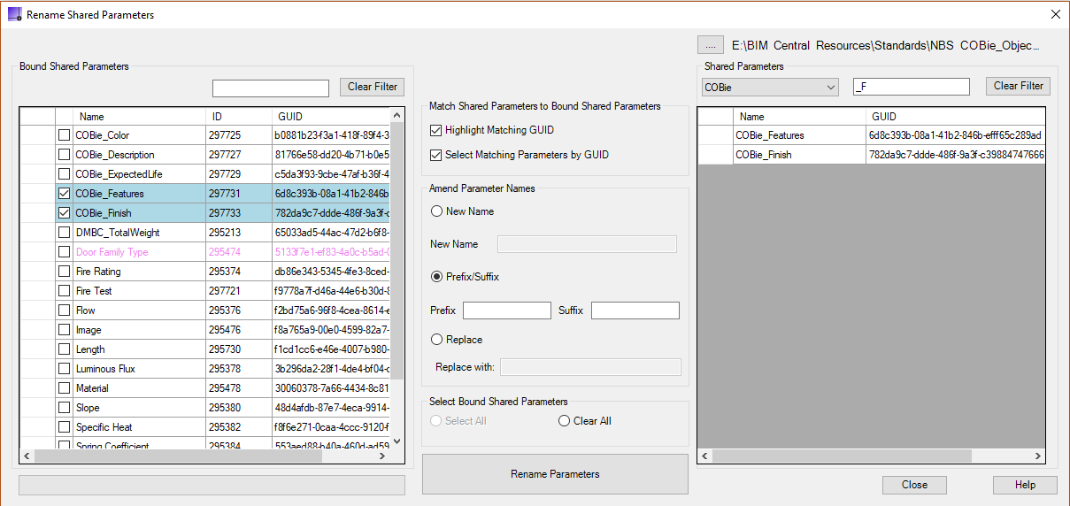Individual bound shared parameter names can be completely changed or multiple parameters can have a Suffix and/ or Prefix added to the name. As well as retaining the parameter formula, the parameters also retain their GUID.