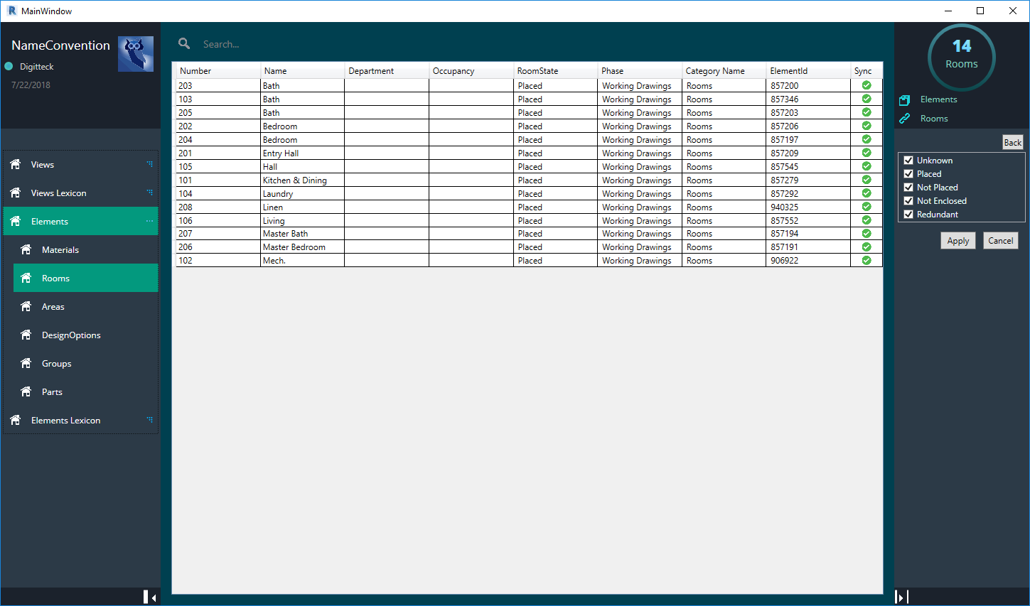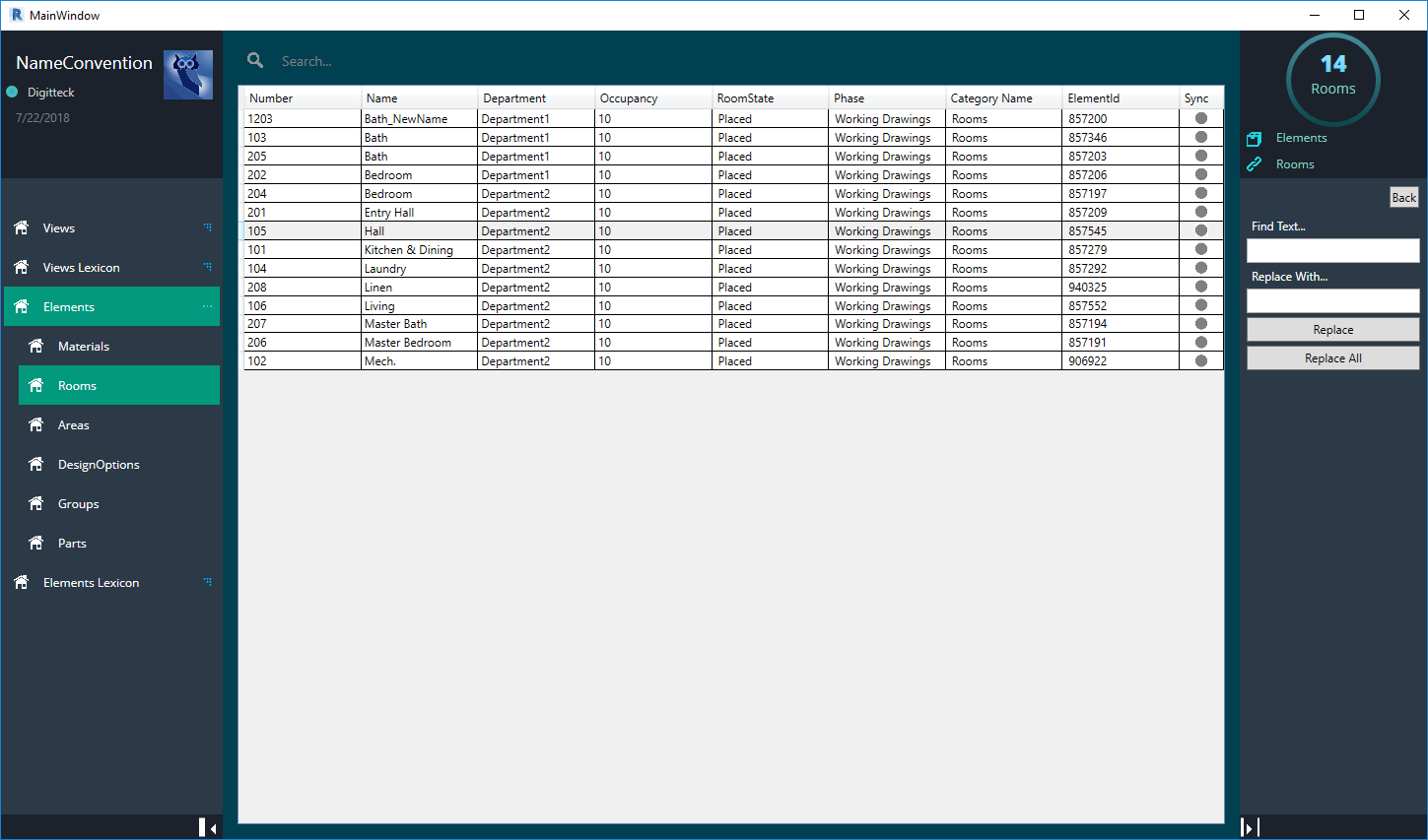 Digitteck® NameConvention™ lets you quickly and easily standardize the names and other parameters of Revit elements. You have access to multiple elements in one place, and you can make the changes needed as simple as double-clicking the element in the grid, or some features like “find and replace” or “wrap”.