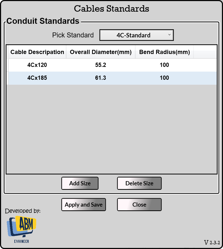3 – Cable diameters List is based on the standard assigned in the conduitType selected, if the user changes the conduitType the list will be updated accordingly.