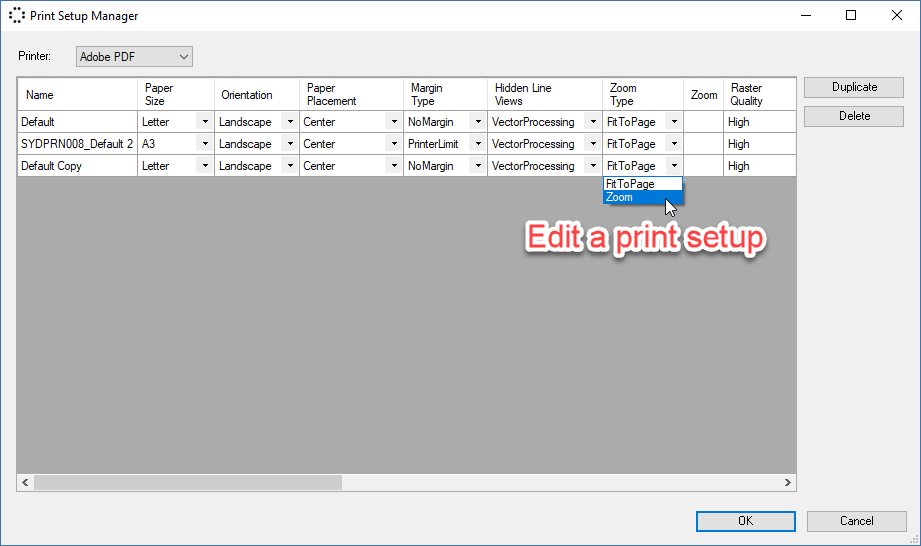 - If you click on a Duplicate button it will copy the selected print setup with a new name.