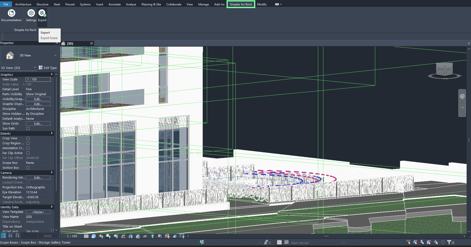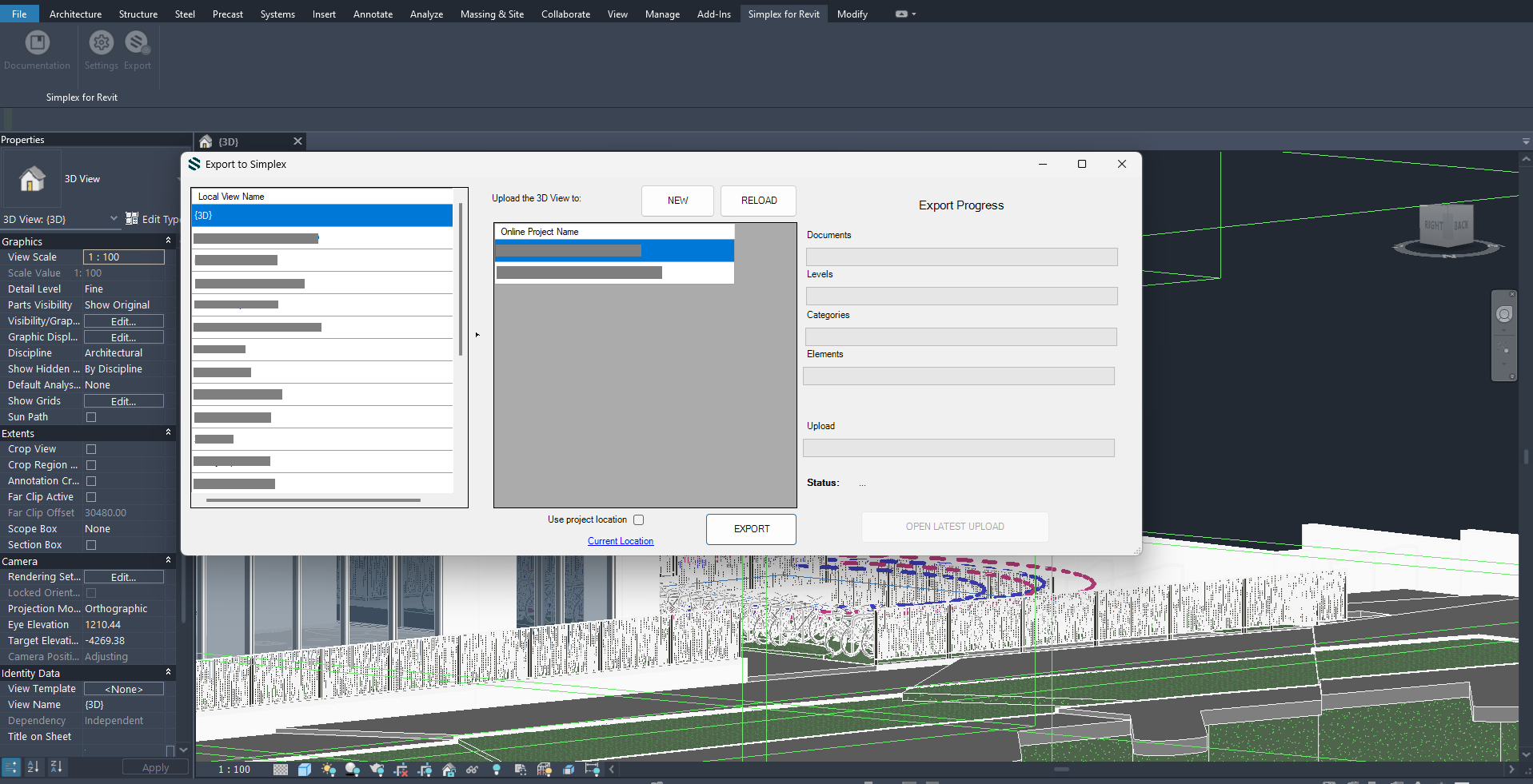 Export from Revit: Open your project in Revit. If you previously inserted a token, click the "Export" button in the Simplex 3D plugin tab