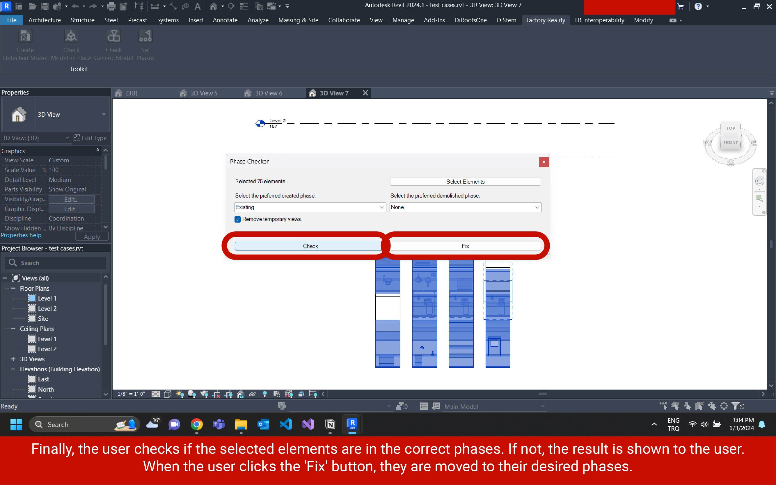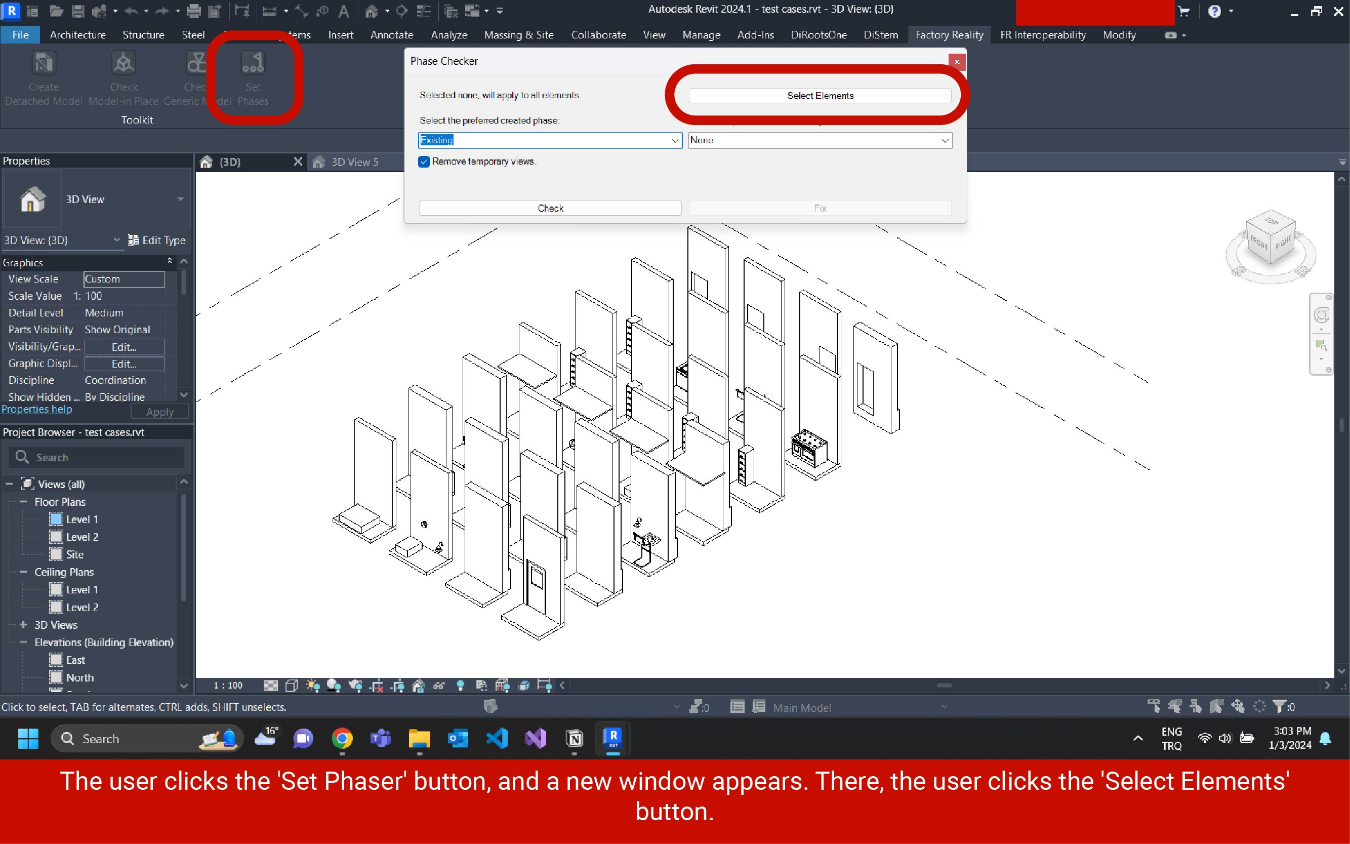 Set Phases: The Set Phases feature empowers users to modify the phases of multiple elements concurrently. Users can select elements for phase adjustment and indicate preferred phases for creation and demolition. Subsequently, users can review and identify any selected sets that are in the wrong phase, allowing for prompt correction. To do that;