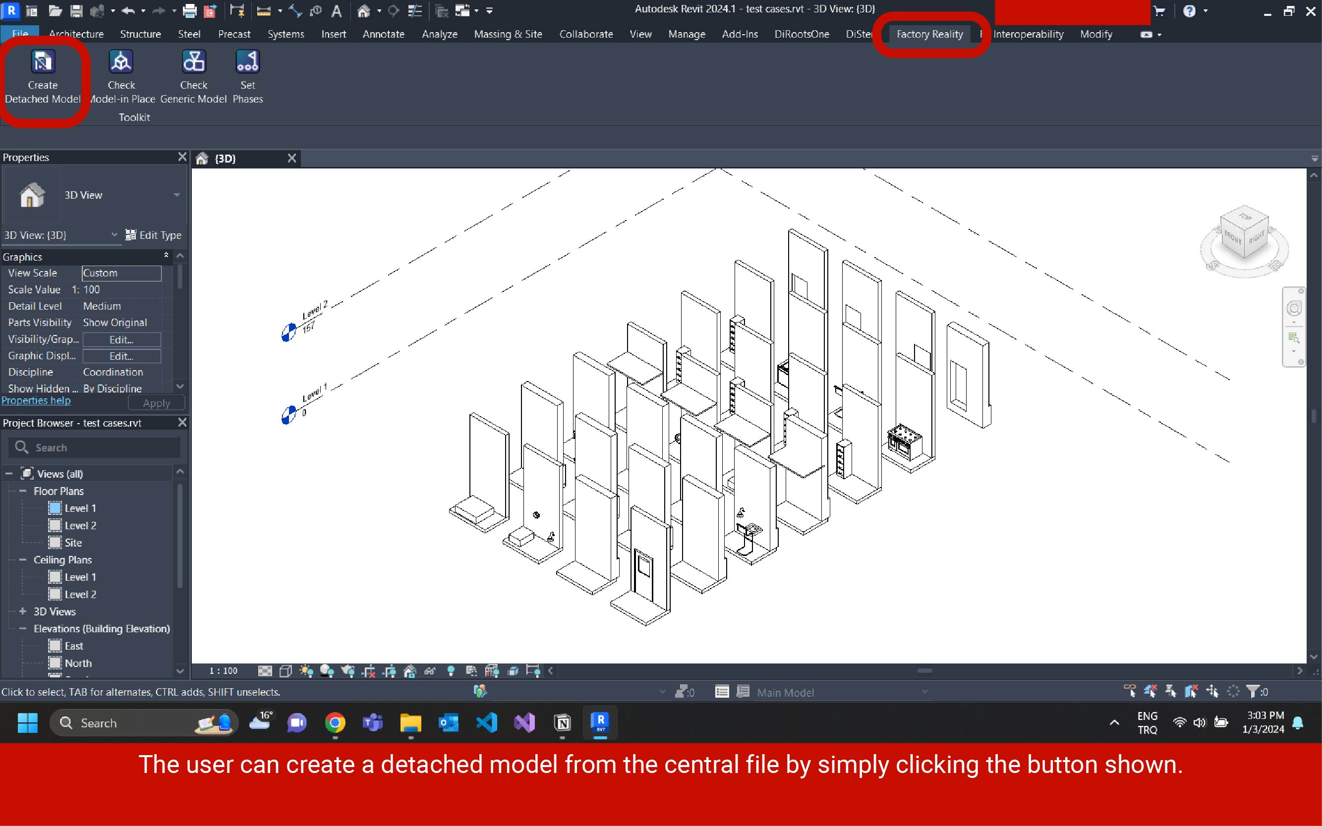 Create Detached Model: This functionality enables users to efficiently generate a detached model from the existing file. In instances where the process of closing Revit and reopening it as a detached model proves time-consuming and cumbersome, this tool allows users to detach the current file from the central model with a single button press. Here's how you can use it:
