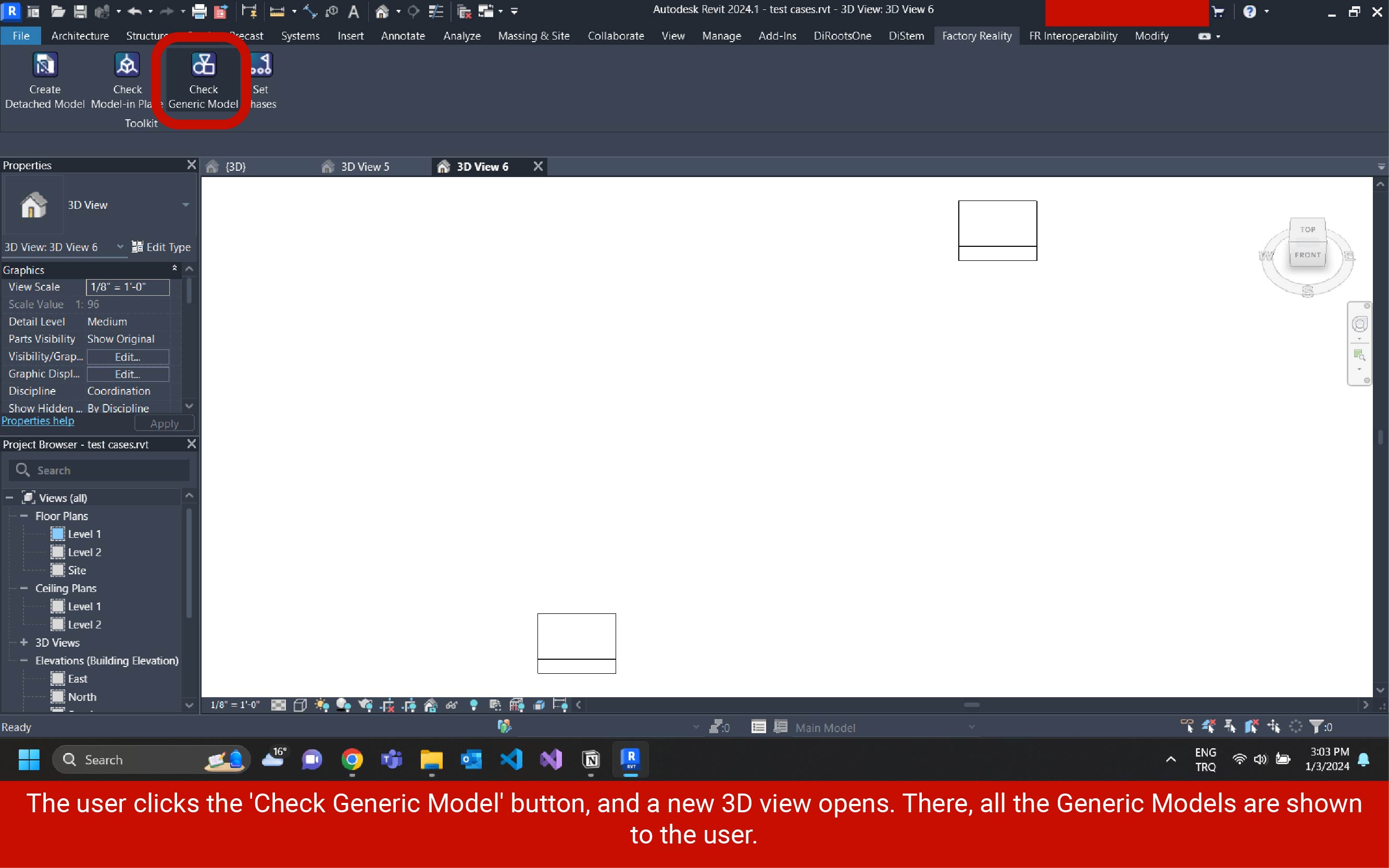 Check Generic Model: This button automates the detection of all Generic Models in the Revit file. Addressing situations where clients prefer to avoid generic models or where managing a multitude of elements within the generic model category becomes intricate, the tool identifies all Generic Models in the file. It then opens a new 3D view, displaying only the identified elements to the user. Here's how you can use it: