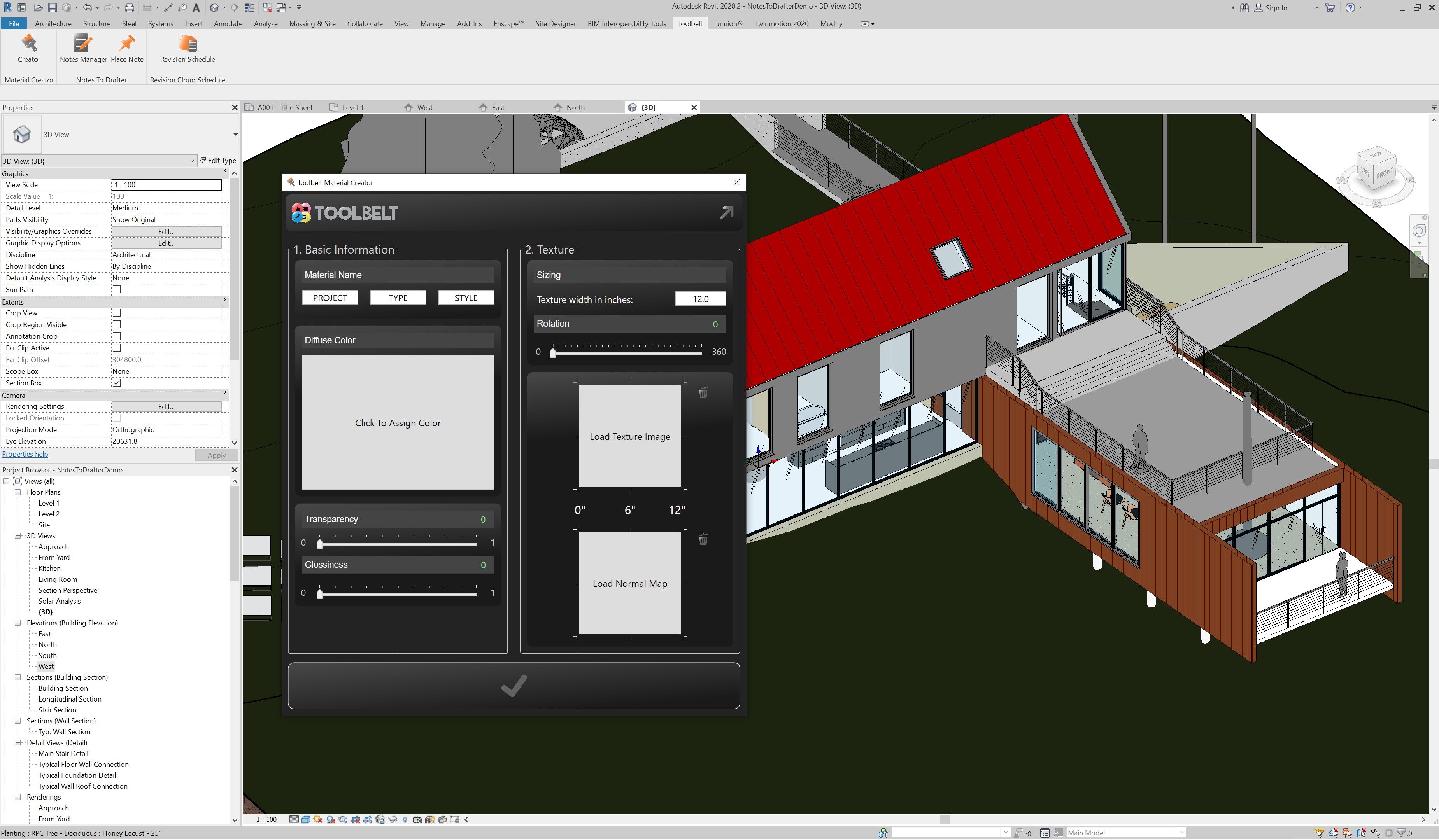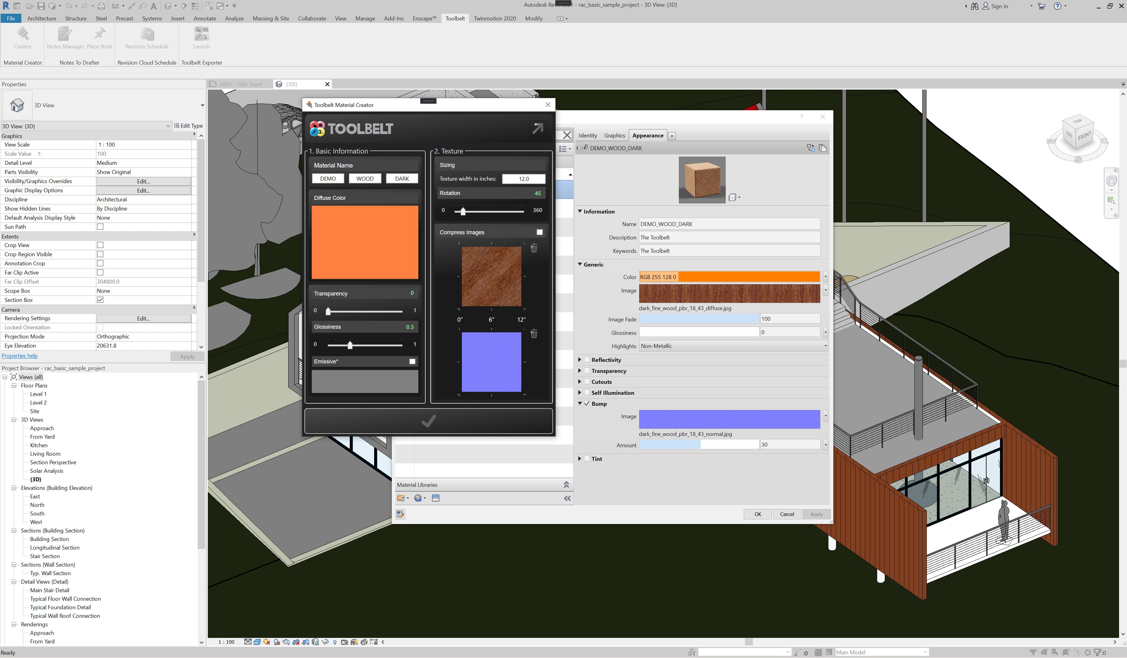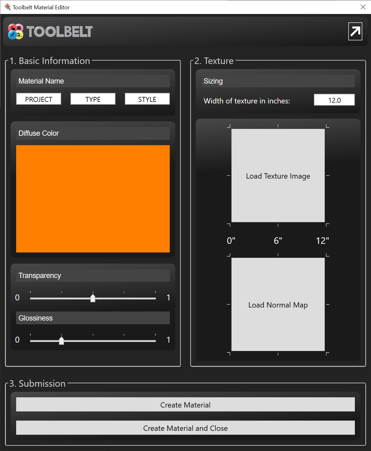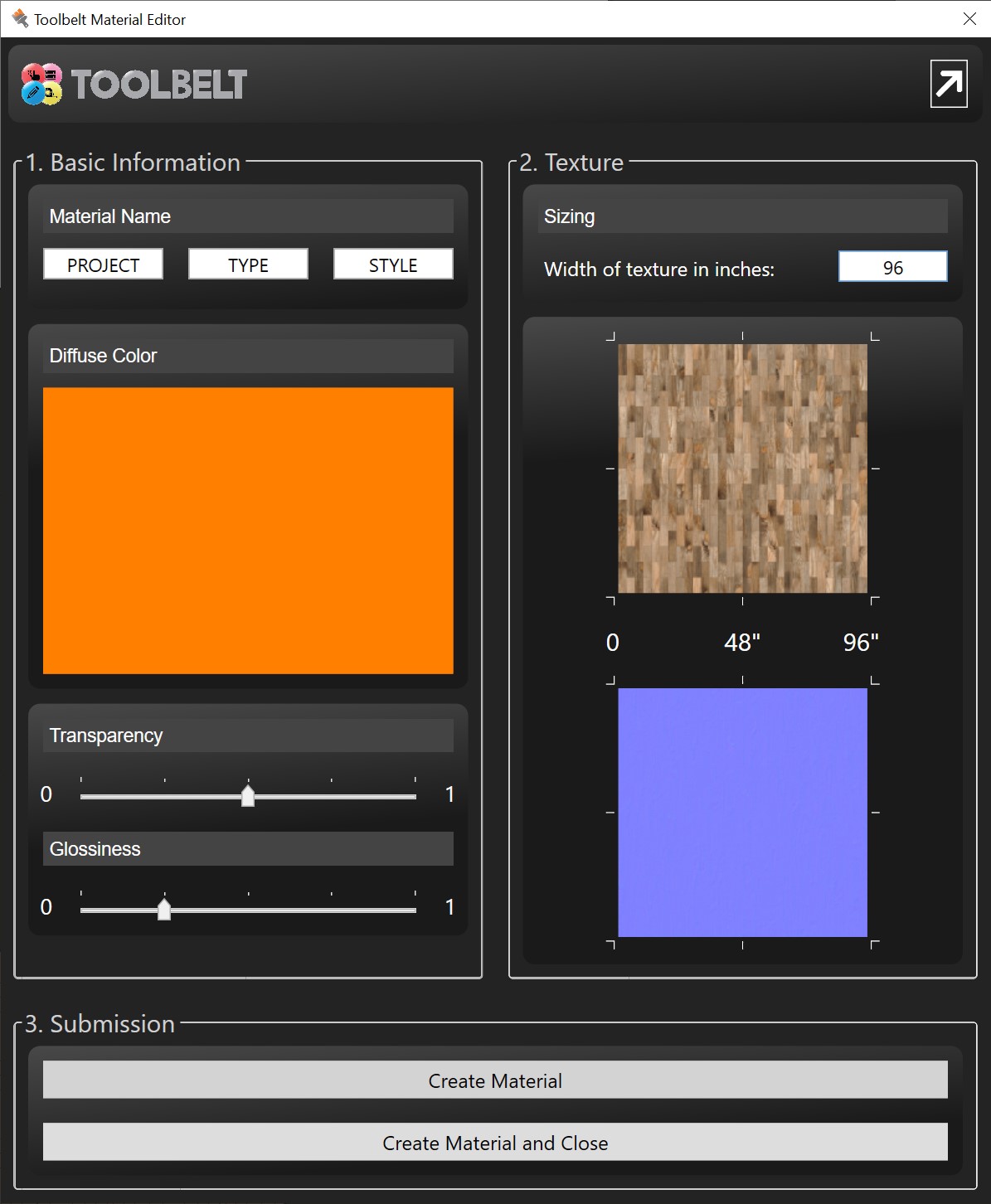 Once successfully installed, a Toolbelt tab will be added to your Revit ribbon. Under the Toolbelt tab, you will find the Material Creator. Open the Material Creator window by clicking on the Creator button with the brush icon.
