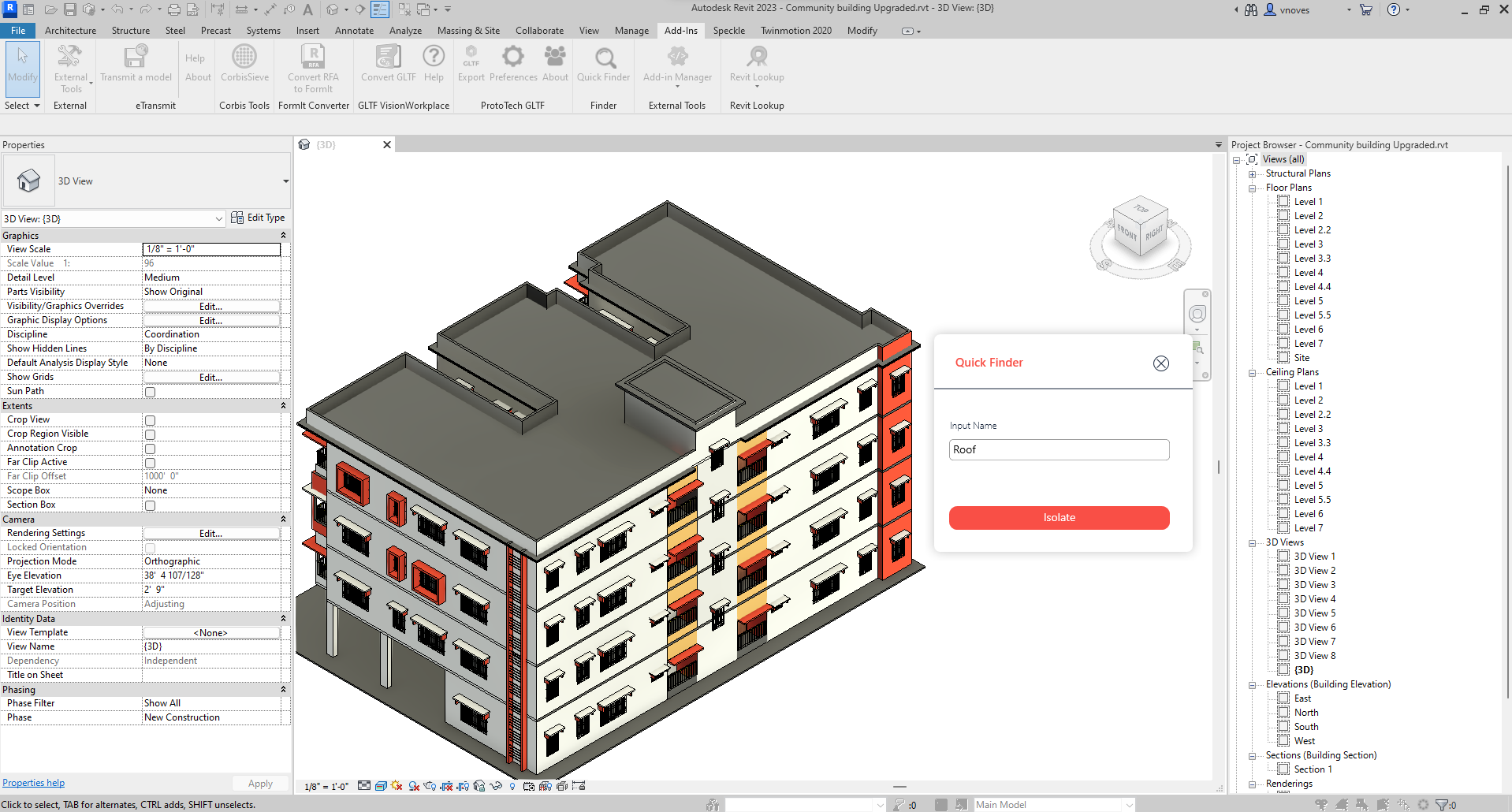 Quick Finder streamlines Autodesk® Revit® projects by isolating elements based on family name or type. Enter a search term to instantly focus on relevant elements in your current view.