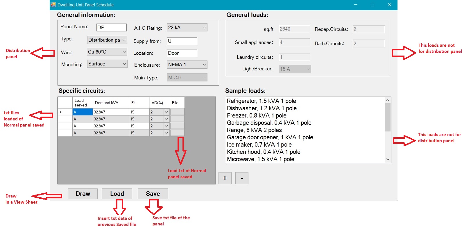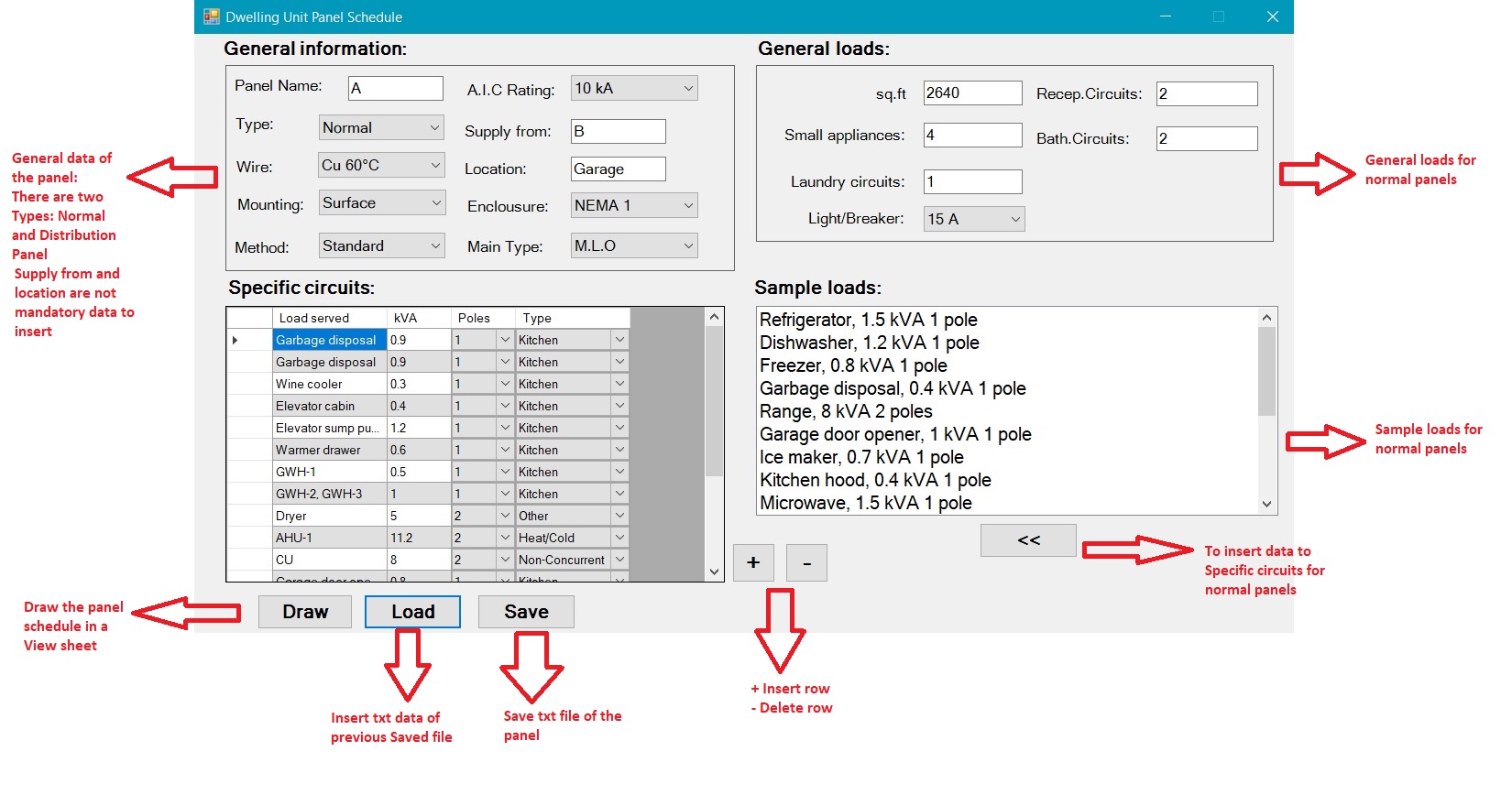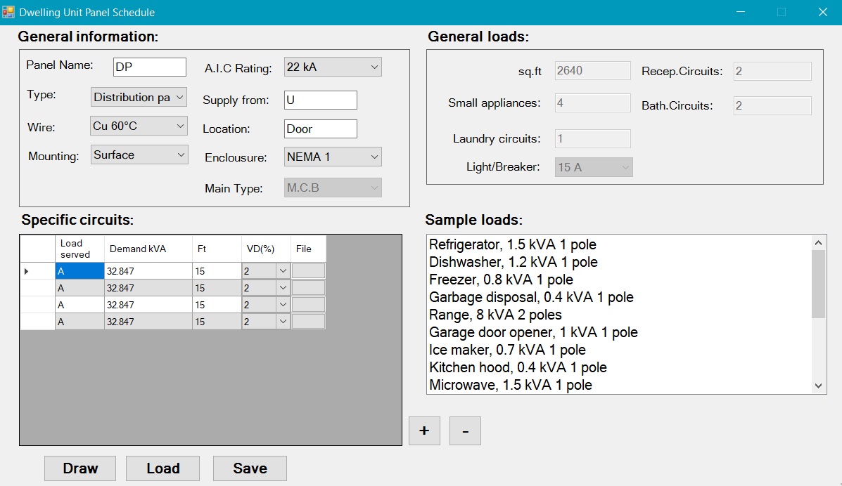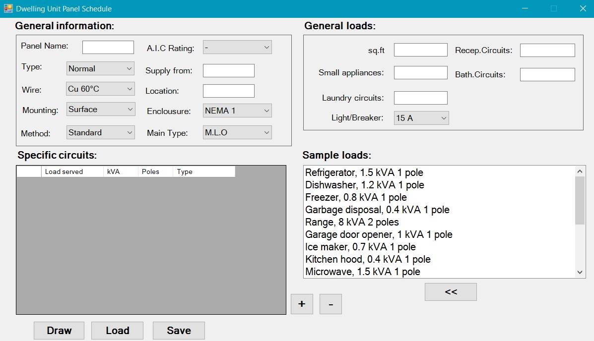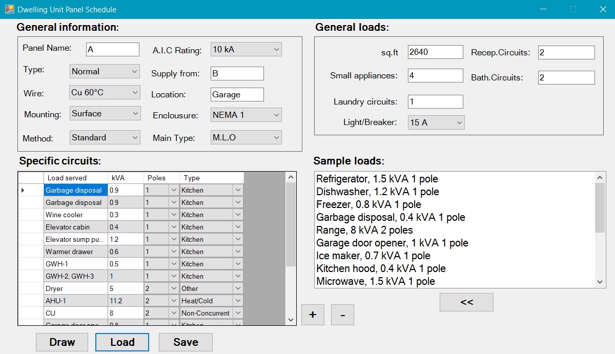 In this schedule, there are four data that the user must insert: Load served, kVA load, number of poles (1 or 2 poles) and the type classification of the circuit (General, Heat/Cold, Kitchen, Other or Non-Concurrent).