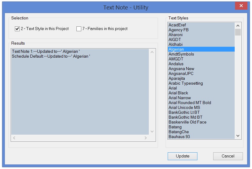 Click Update once update starts, TextUtility application will loop through every text note style one by one and update to the new text style you specified.