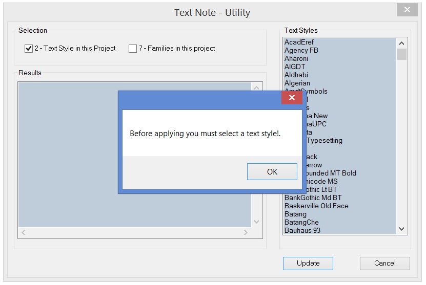 From the "Text Note Utility" Form "Selection" group make a selection to update.