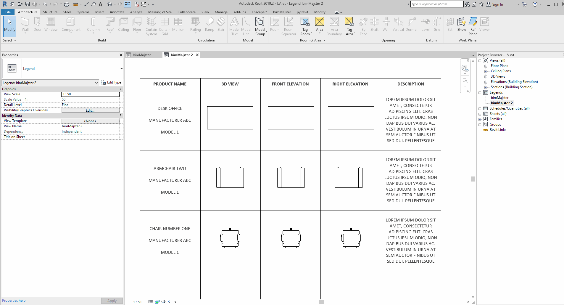 In order to change the view direction of your legend component please select it and click on desired view type from bimMajster tab. Views are located in Legend Component Hidden Views section. If you clicked on desired view with no components selected, the select by rectangle command will be initiated. You can select now multiple elements from your Legend view. All selected legend components will be changed to the preferred view type.