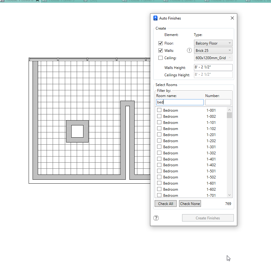 - The Room Finishes window will appear and you can use it to select a Floor Type, Wall Type, and Ceiling type for your finishes. You can also choose which of those you want to create.