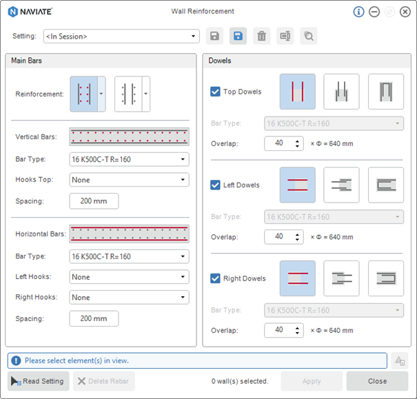 - Rebar types, shape codes, hooks and element cover settings from the project are recognized and used for rebar creation.
