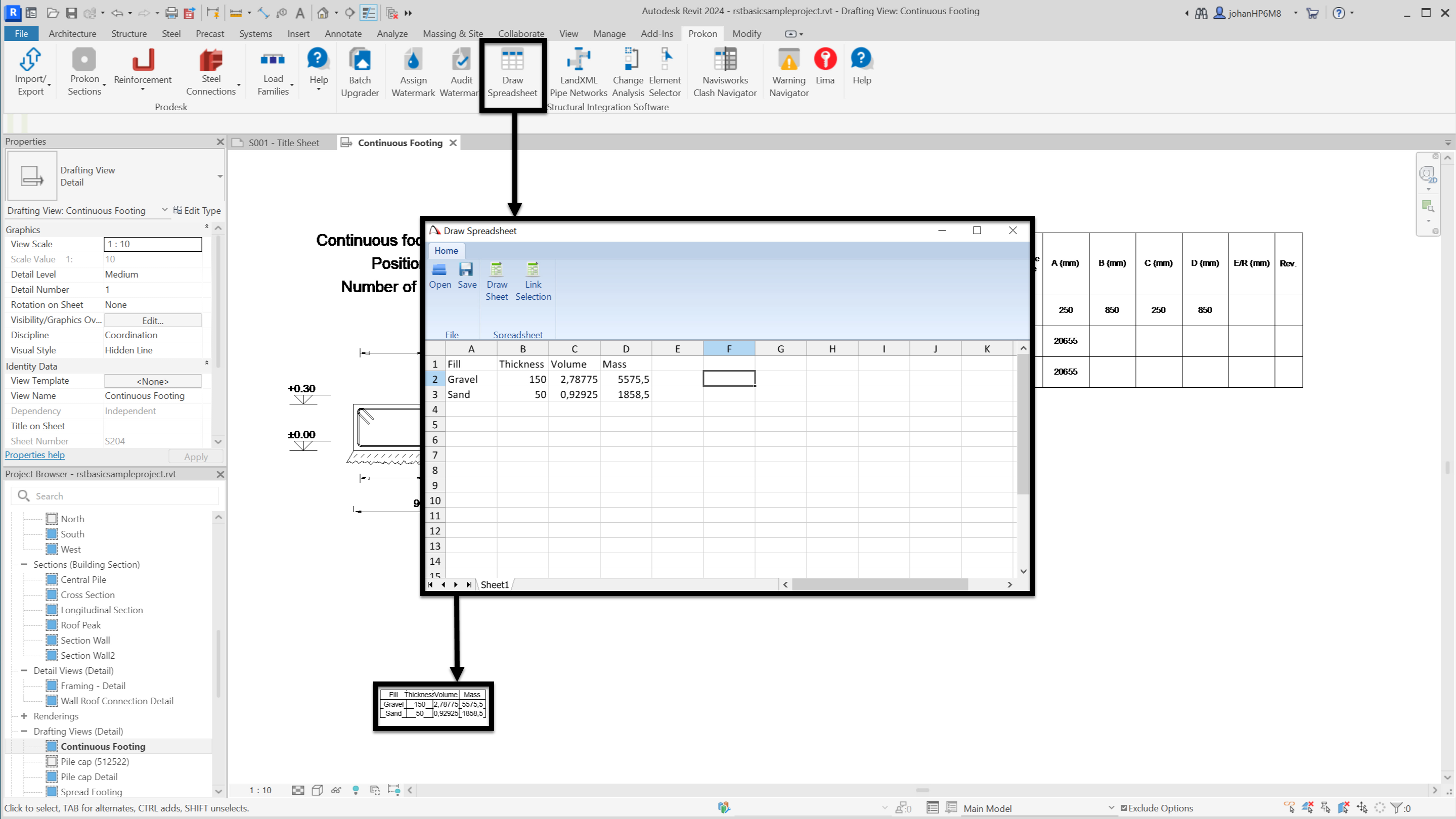 - Draw Spreadsheet: With a project open in Revit and a drafting view active, go to Prokon > Draw Spreadsheet. Choose a .csv or .xlsx file. In the spreadsheet view, highlight the data that you want to insert. Click Draw Spreadsheet to insert it into the active drafting view.