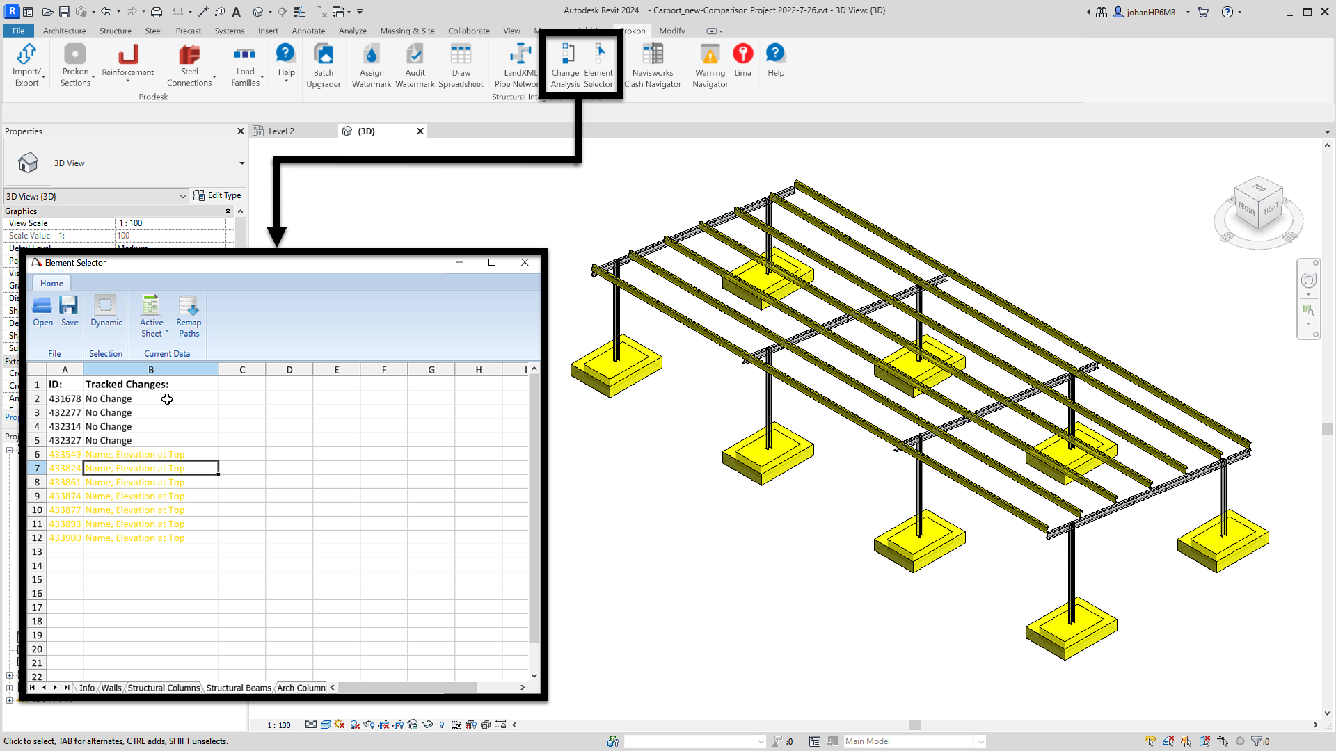 - Change Analysis: To run the analysis open a new project in Revit. Go to Prokon > Change Analysis. Enter the directories for the current and previous versions of the project to compare. Select the elements to analyze and click Start. Once complete, click through the different sheets in the spreadsheet view to see the results of the analysis.