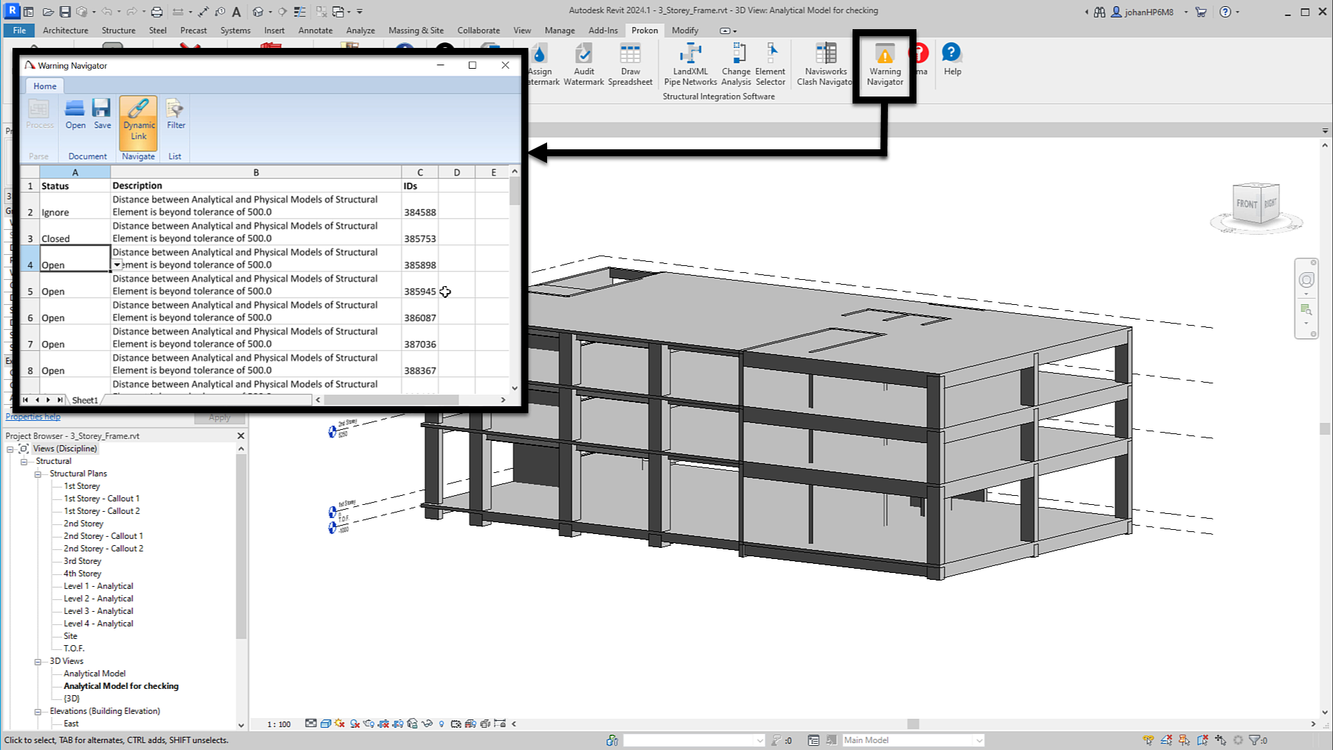 - Warning Navigator: With the project open in Revit, go to Manage > Inquiry > Warnings. Save the warning in HTML format. Go to Prokon > Warning Navigator and open the HTML file. Click Process to parse the data into a useful worksheet view.