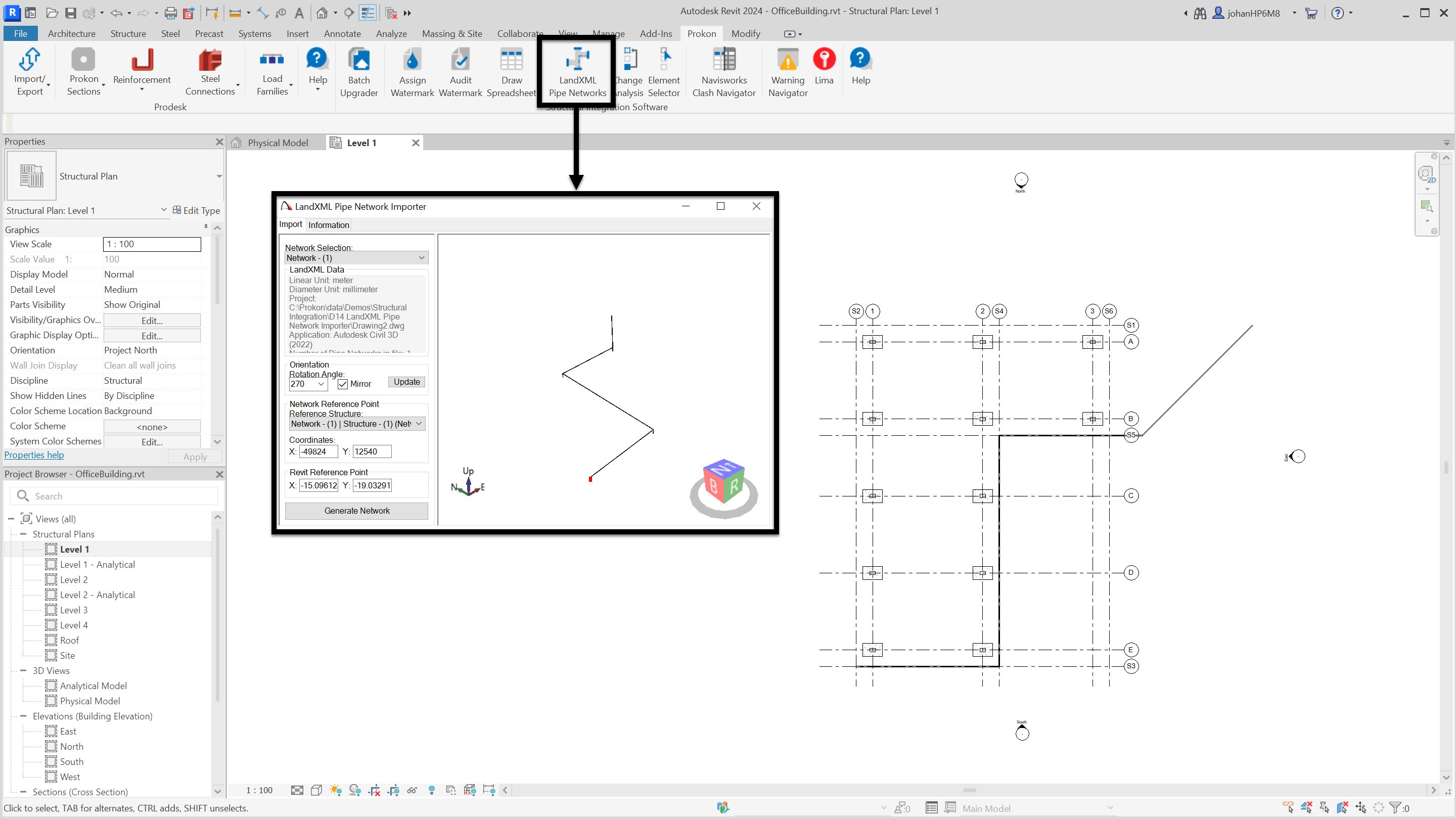 - LandXML Pipe Network Importer: Export a LandXML file from Autodesk® Civil 3D® that contains a pipe network. With a project open in Revit, go to Prokon > LandXML Pipe Network Importer. Specify the insertion point. Choose the LandXML file when prompted and click Open. Configure the import information and when satisfied click Generate Network.