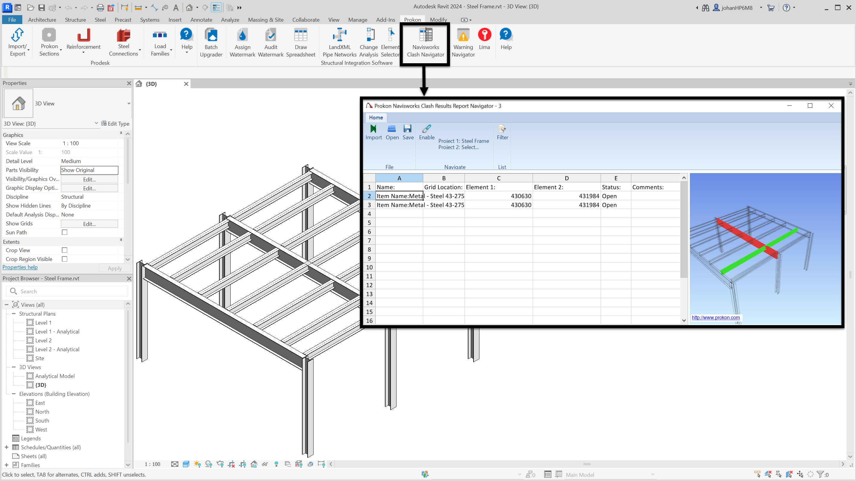 - Autodesk® Navisworks® Clash Navigator: Export a Revit model to Navisworks Manage and run a clash study. Save the report to the file. Back in Revit, go to Prokon > Navisworks Clash Navigator. Click Import and select the report file. Click the items in the spreadsheet to view clashes.