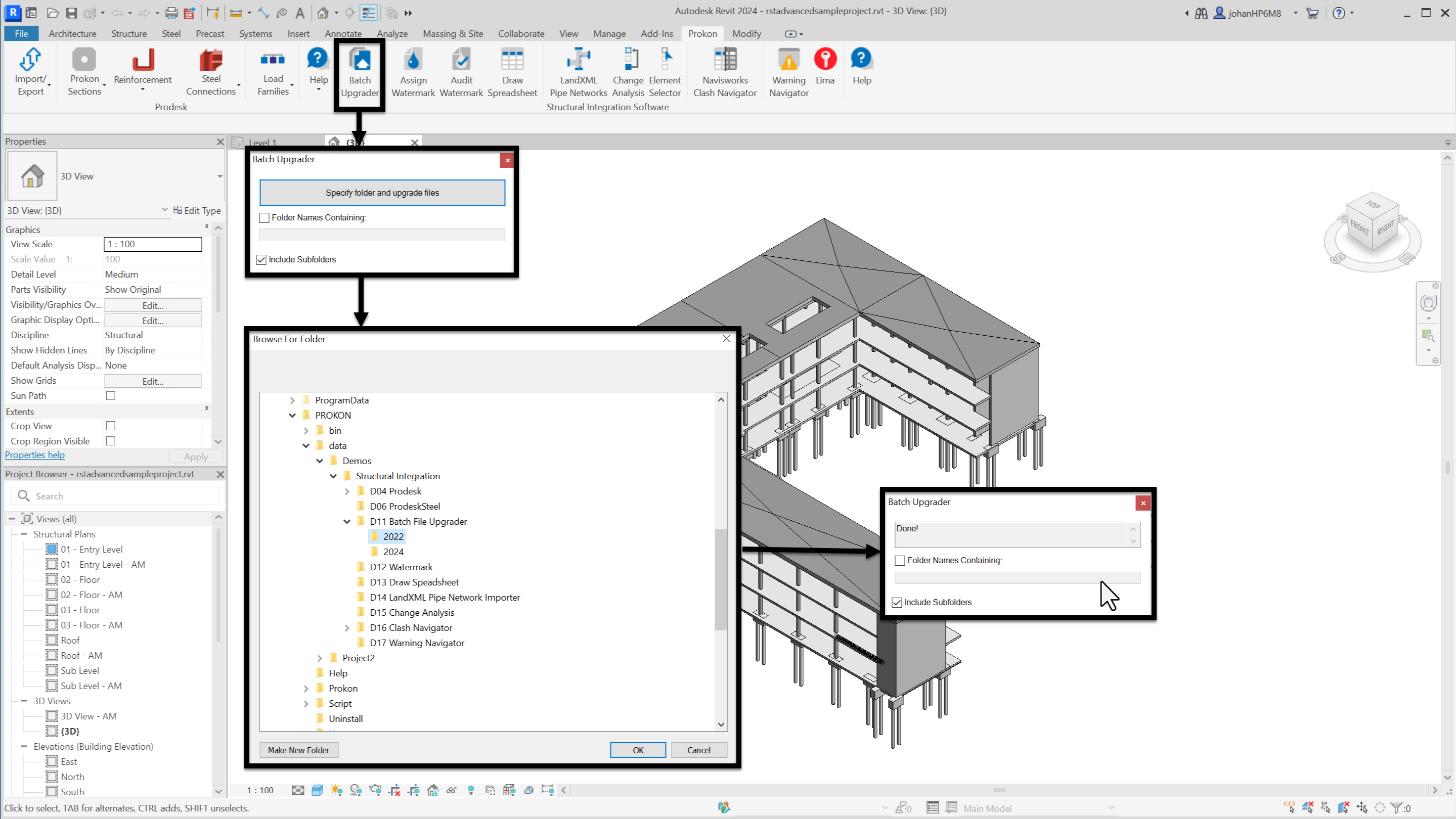 - Batch File Upgrader: With a project open in Revit, go to Prokon > Batch Upgarder. Click Specify folder and upgrade files. Choose the files you want to upgrade and click OK to start the upgrade.