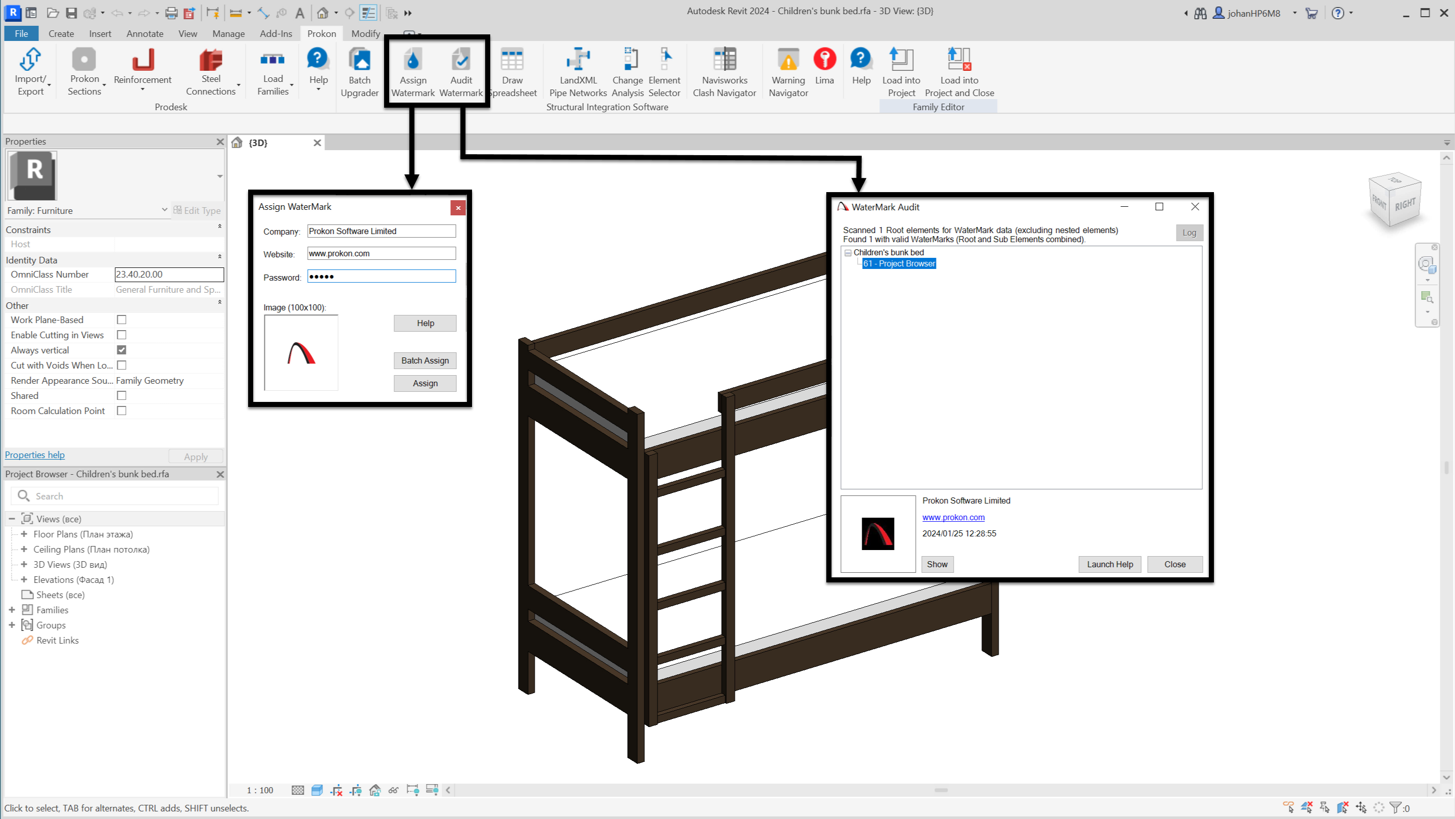 - Watermark: To add a watermark to your project or family, go to Prokon > Assign Watermark. Enter the required information and click Assign. Choose if the watermark must be added to the document level or the element level. Click Finish. To view a watermark, go to Prokon > Audit Watermark. Choose the level to scan. Click on elements in the tree to view watermarks.