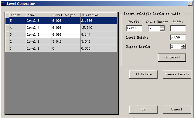 After you have specified this information, click "<< Insert" button. This fills in the table with the floor information. Note: At this stage, the new levels have not been created in the Revit document.