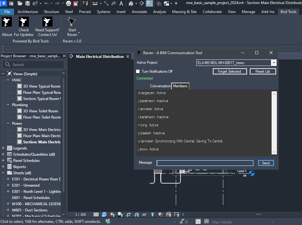 "Bird Tools - Raven - A BIM Communication Tool" is an Autodesk® Revit® communication tool that monitors the user's activity for the new BIM 360 Design and Autodesk Construction Cloud® platforms, and enables users to send instant messages through a common conversation specific to the project they are collaborating in. In addition to BIM 360 Design, Raven also supports Revit Server, local workshared, and Nasuni-hosted models.