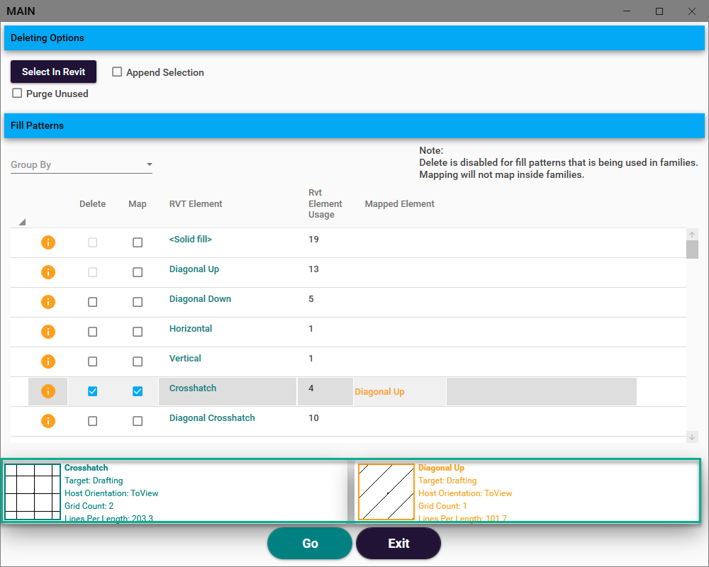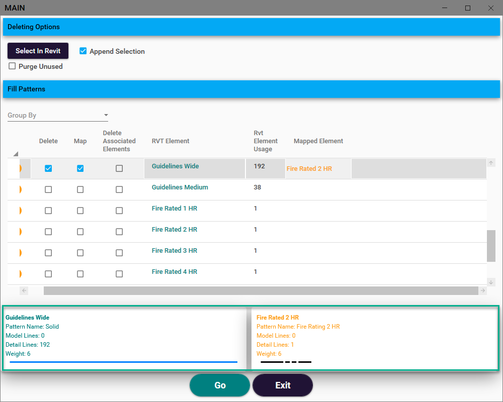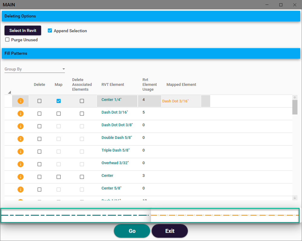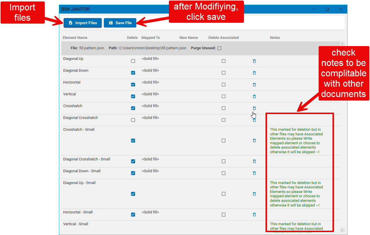 Except for text styles, these items are not checked by Revit's "Purge Unused" command. BIM Janitor goes beyond just checking for unused styles and patterns. It also allows a user to convert from one style\pattern to another, delete all the elements using a style\pattern and preview all the views\elements using a style\pattern before removing it.