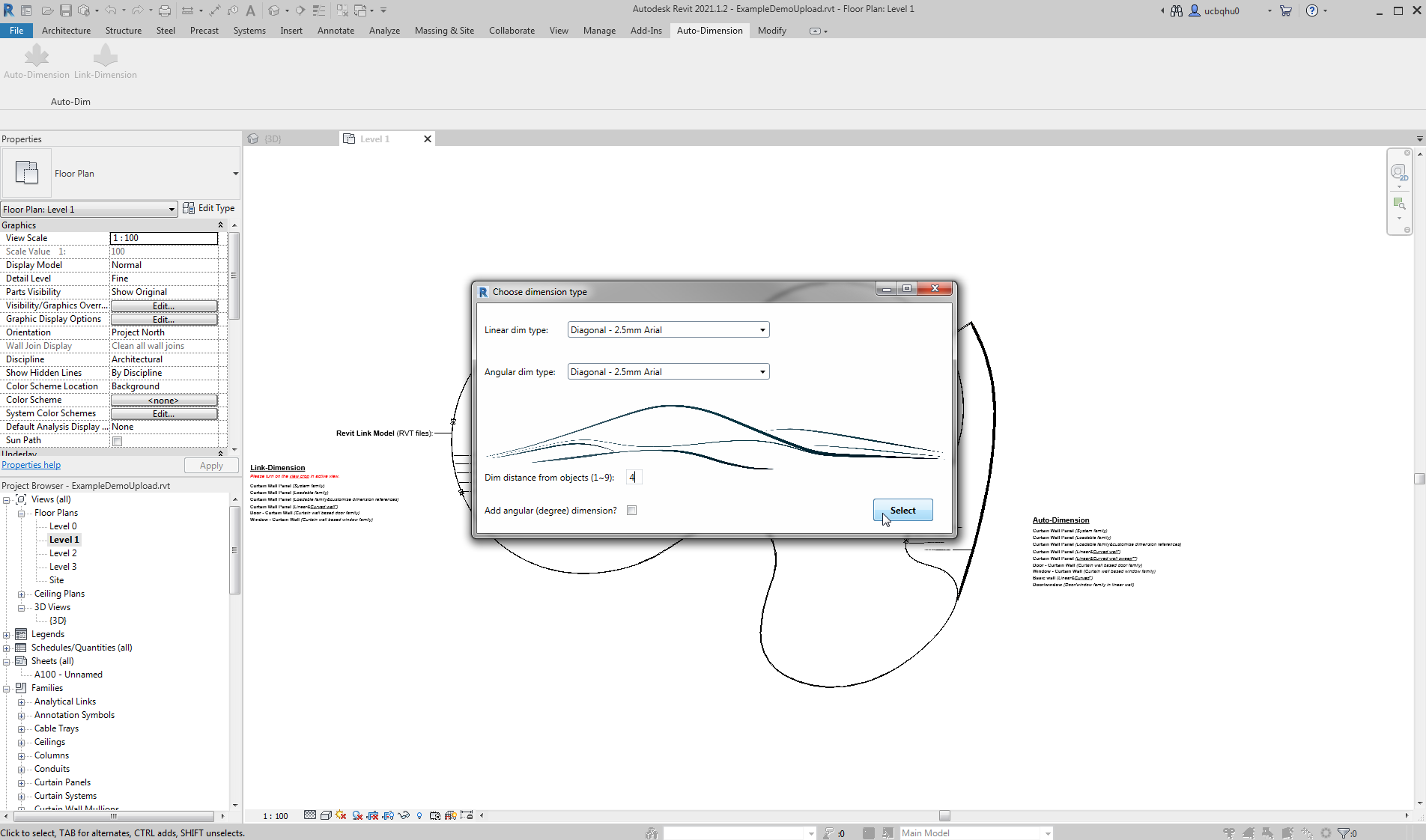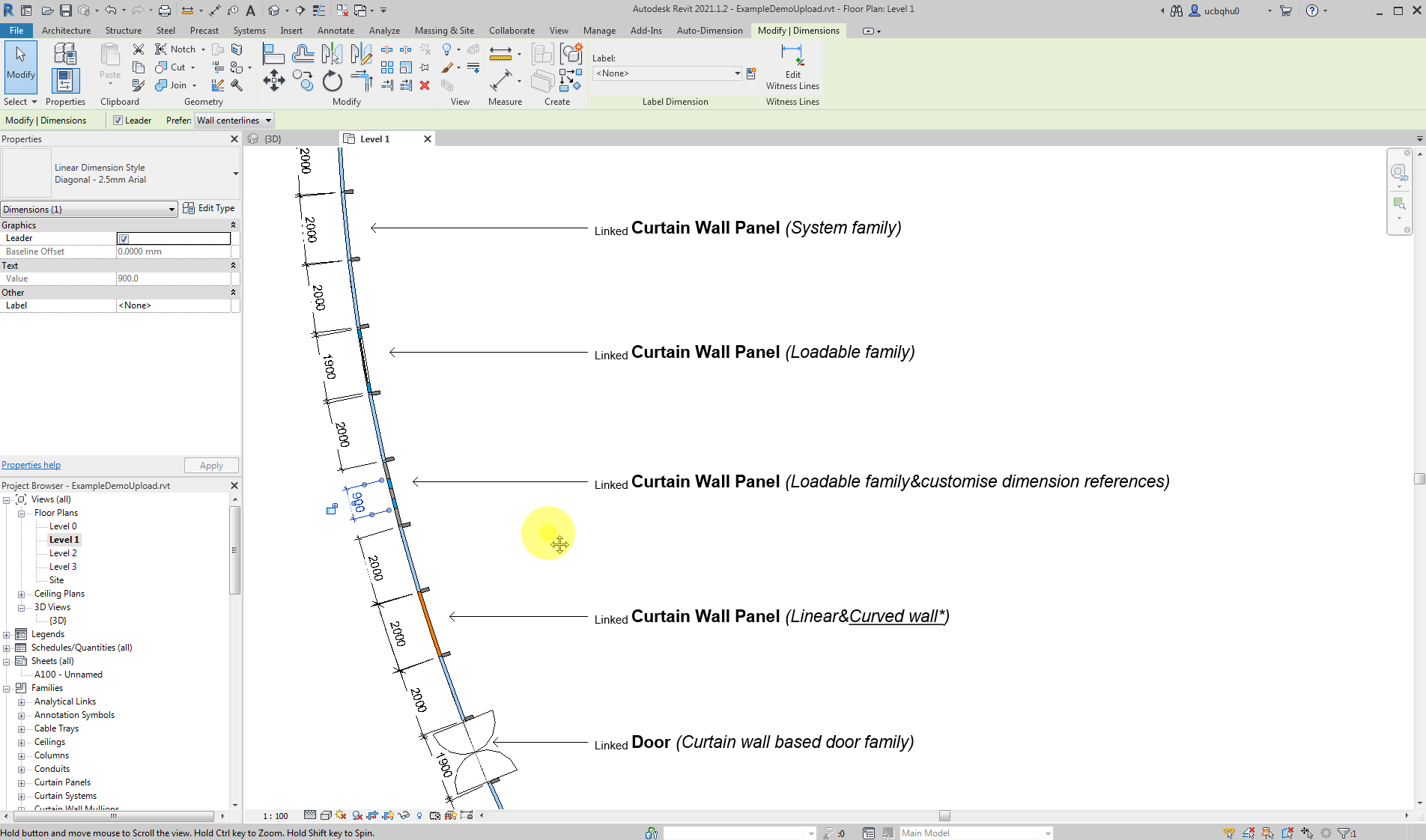 - Curtain wall panel (wall type): Linear dimensions are placed for linear walls. *For curved walls, angular dimensions are placed and the arc length value of the curved wall would overwrite the angular dimension values. the unit of this value follows the project units for length (Manage Tab -> units -> length).