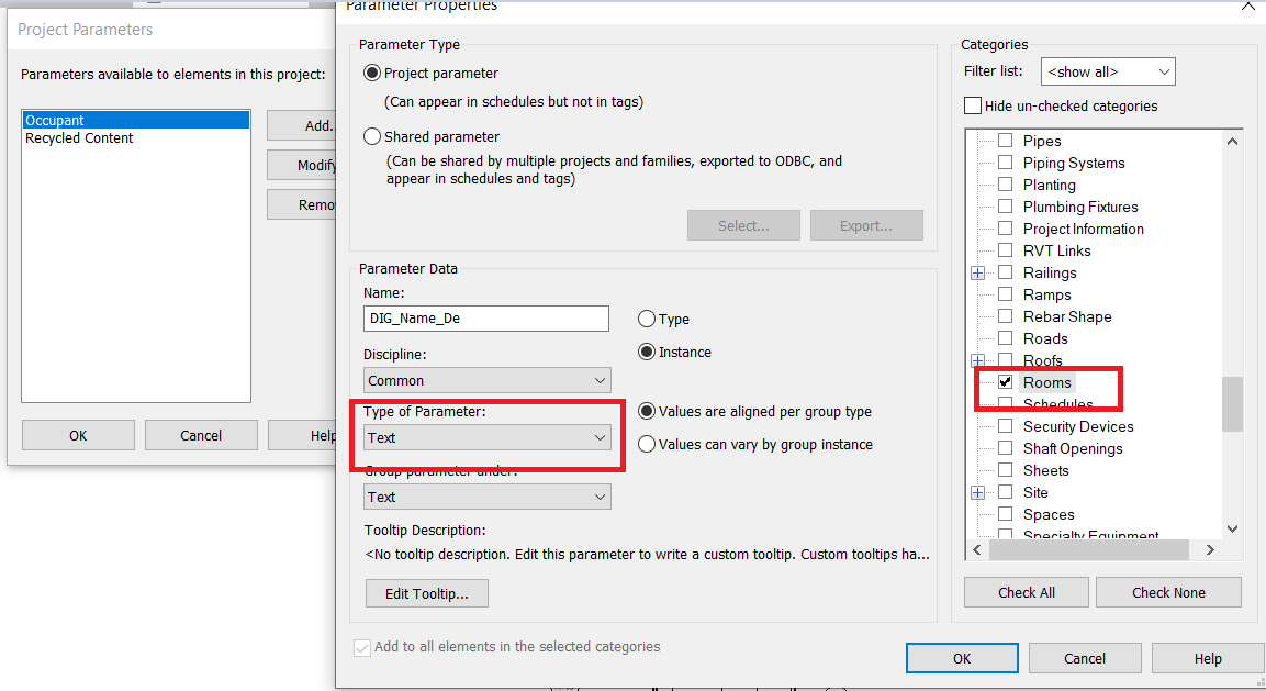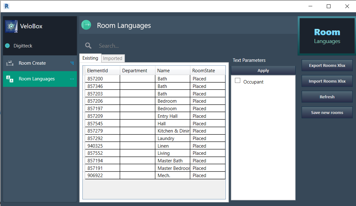 Feature 2 - RoomLanguages: For a multi-national process, where you need to keep the translated values of some parameters in multiple languages, the add-in lets you create the list of values, for each room and the parameter it is assigned to (e.g. for a room name you can define DIG_Name_En, DIG_Name_De and these will be the parameters that will store this information. In the Excel file provide values for these parameters and the add-in will fill them for you)