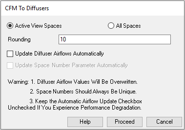 The Space CFM To Diffusers is a tool that roundS space specified airflows based on the user input, divide, and round that flow over the corresponding diffusers based on the systematic classification of these diffusers’ systems (or connectors) and on the space they belong in. It avoidS all the arithmetic involved in this distribution and the manual modification of that flow in each diffuser, and thus maintains consistency between the specified space flows and the diffuser flows.