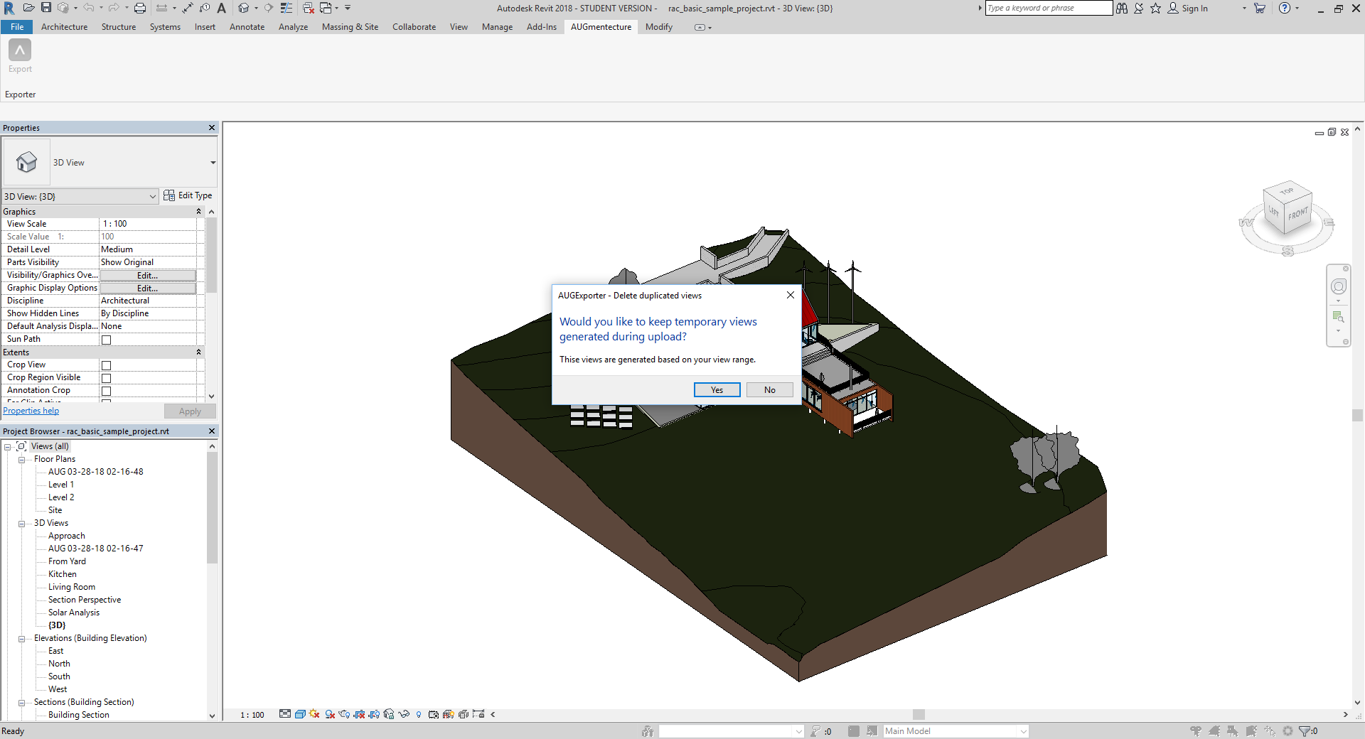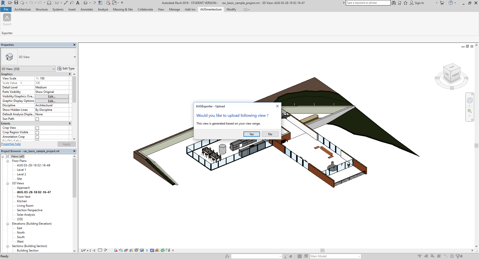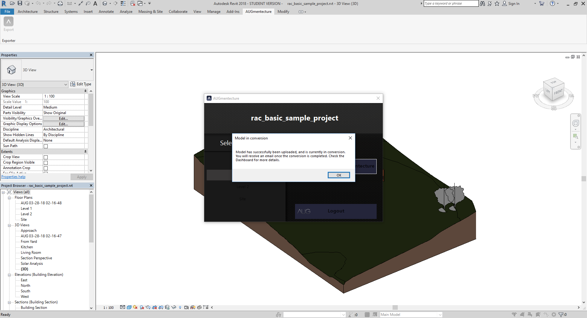 AUGmentecture is a service helping you to view complex 3D models on a mobile device in an Augmented Reality(AR) format. With the help of AUGmentecture plugin, you can seamlessly and securely upload your 3D models and floor plans directly from Autodesk® Revit® to your AUG account to view them later with your mobile device. You just need to select the model in 3D view and optionally select floor plan and you will be able to see the model on your mobile device mapped on your floor plan.
