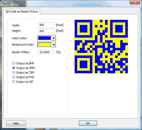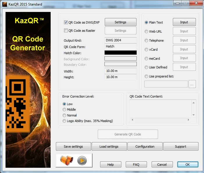 KazQR generates QR codes as raster images (JPEG,TIFF etc.) and DWG/DXF files for CAD systems as real vectors.