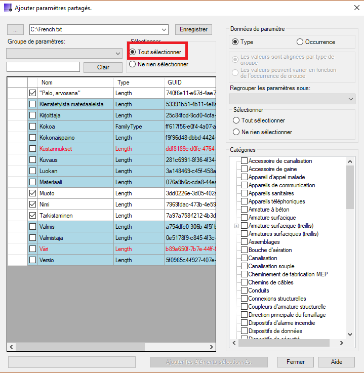 Il souligne également les paramètres qui existent déjà dans le document actif et paramètres obsolètes, qui ne sont pas liés à une catégorie.