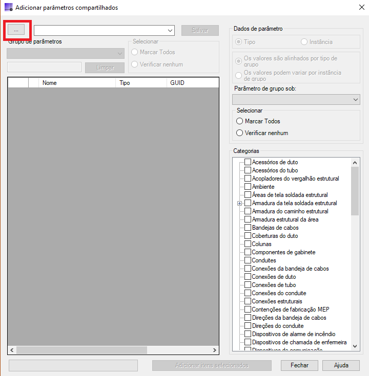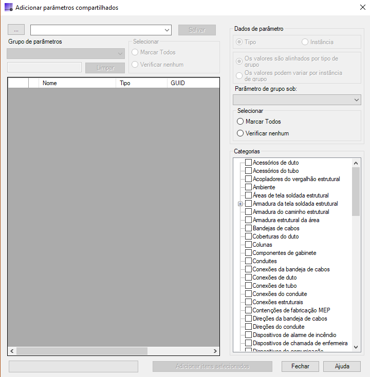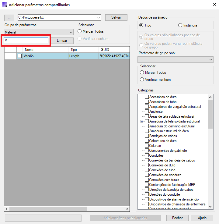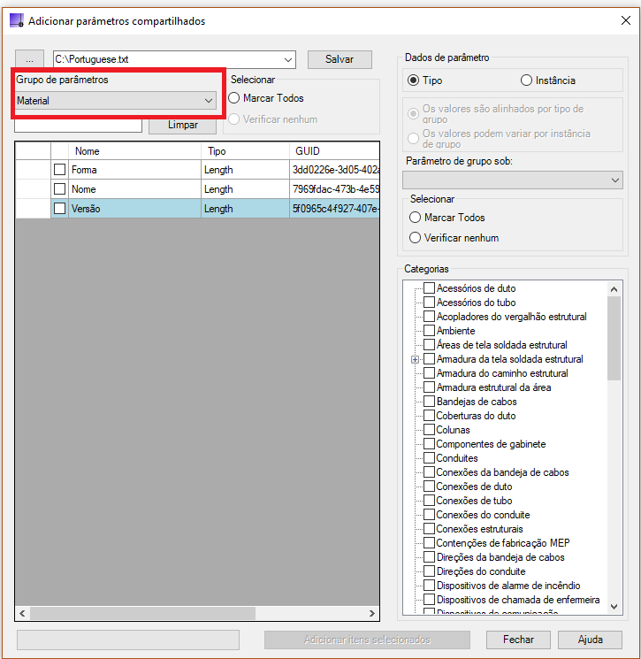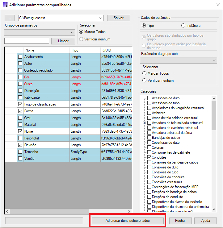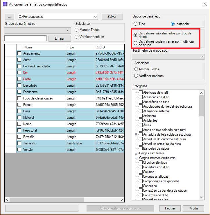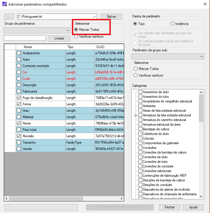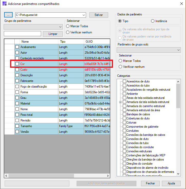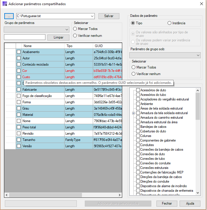 Ele também destaca parâmetros já existentes dentro do documento ativo e parâmetros obsoletos, que não estão vinculados a uma categoria.