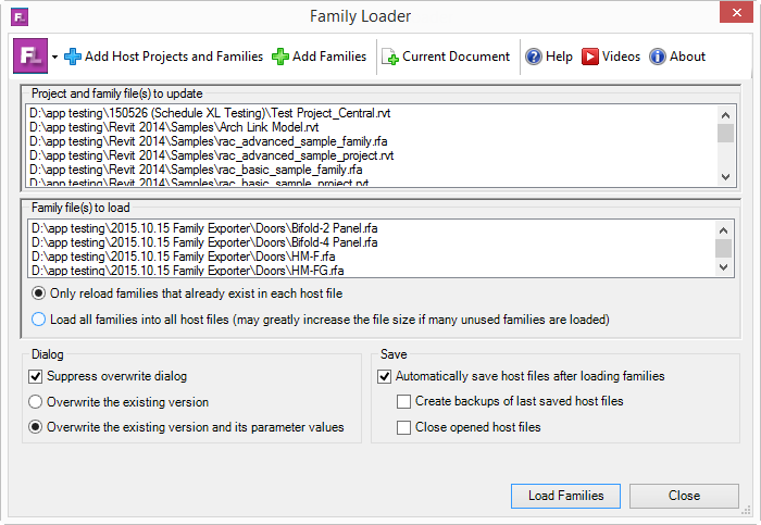 This tool allows users to select multiple families to load or to nest into multiple projects/families, reload only those families into an existing project, and provides the option to overwrite existing parameter values.