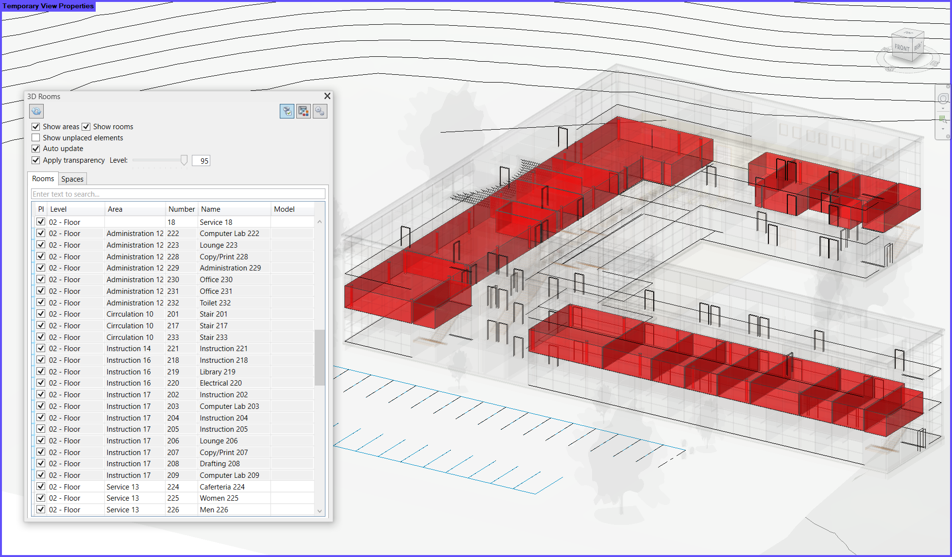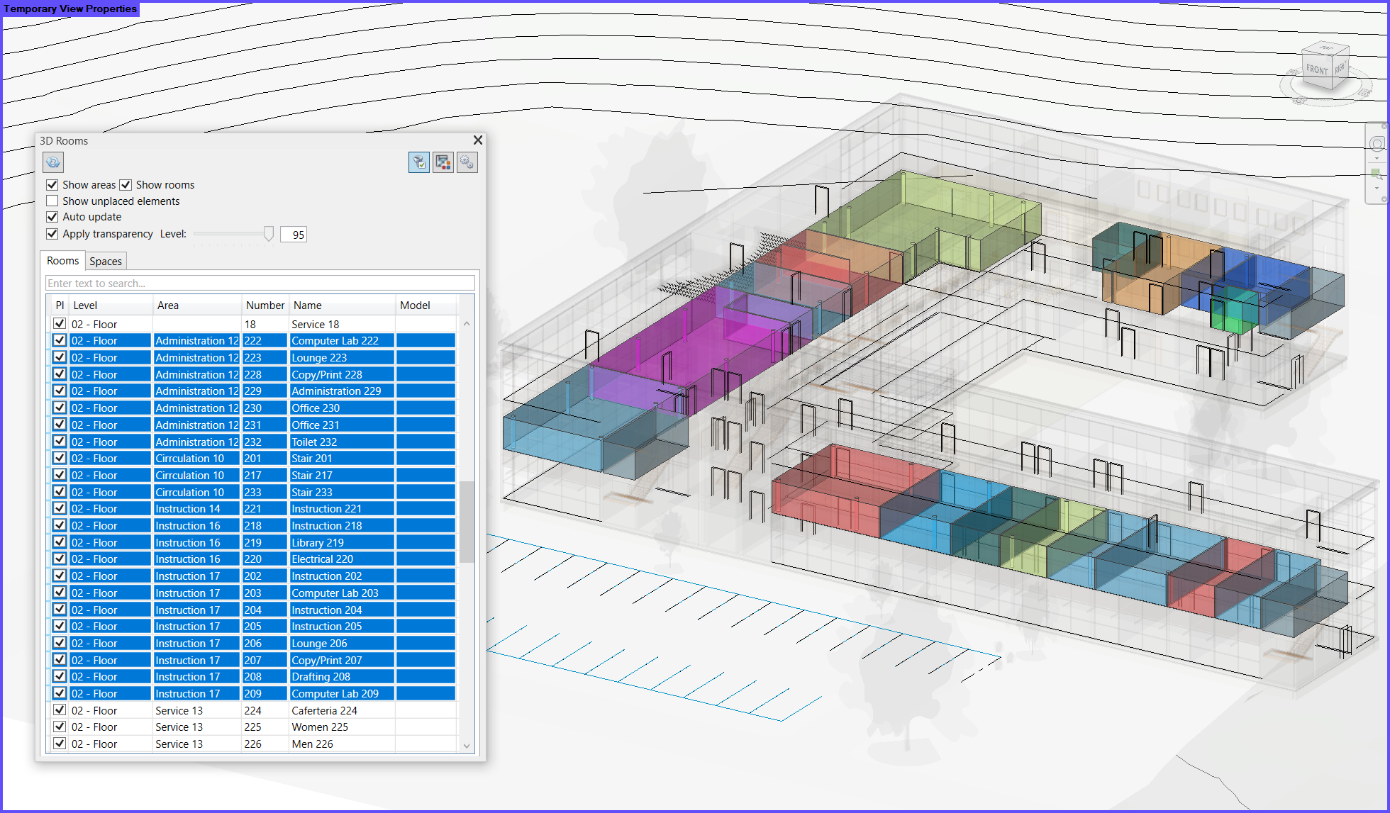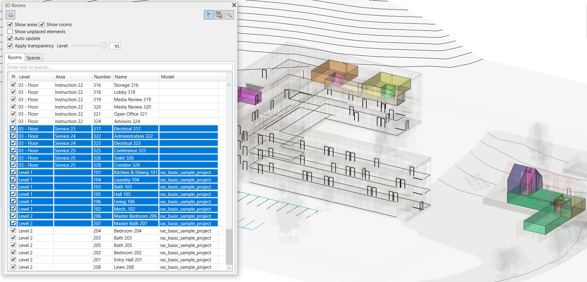 • Highlighting doesn't generate temporary elements in the model, so it's realtime even if hundreds of rooms are selected.