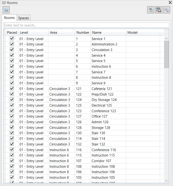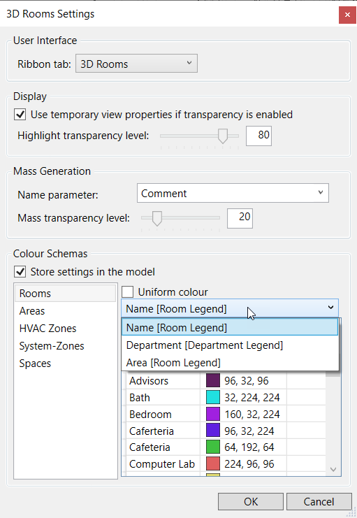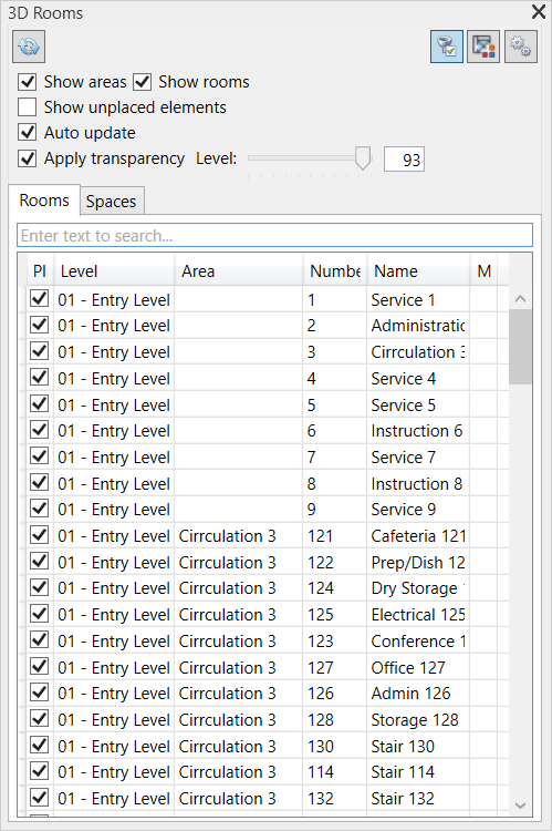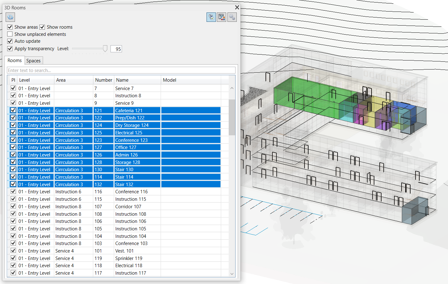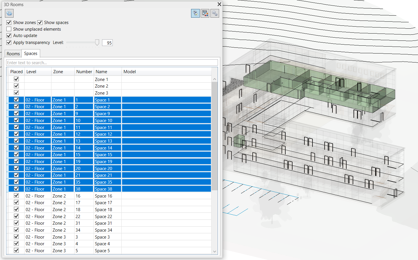 Lists all Rooms, Areas, Spaces, Zones and System-Zones. Highlights the selected spatial elements in 3D View. Generates Masses for the selected spatial elements.