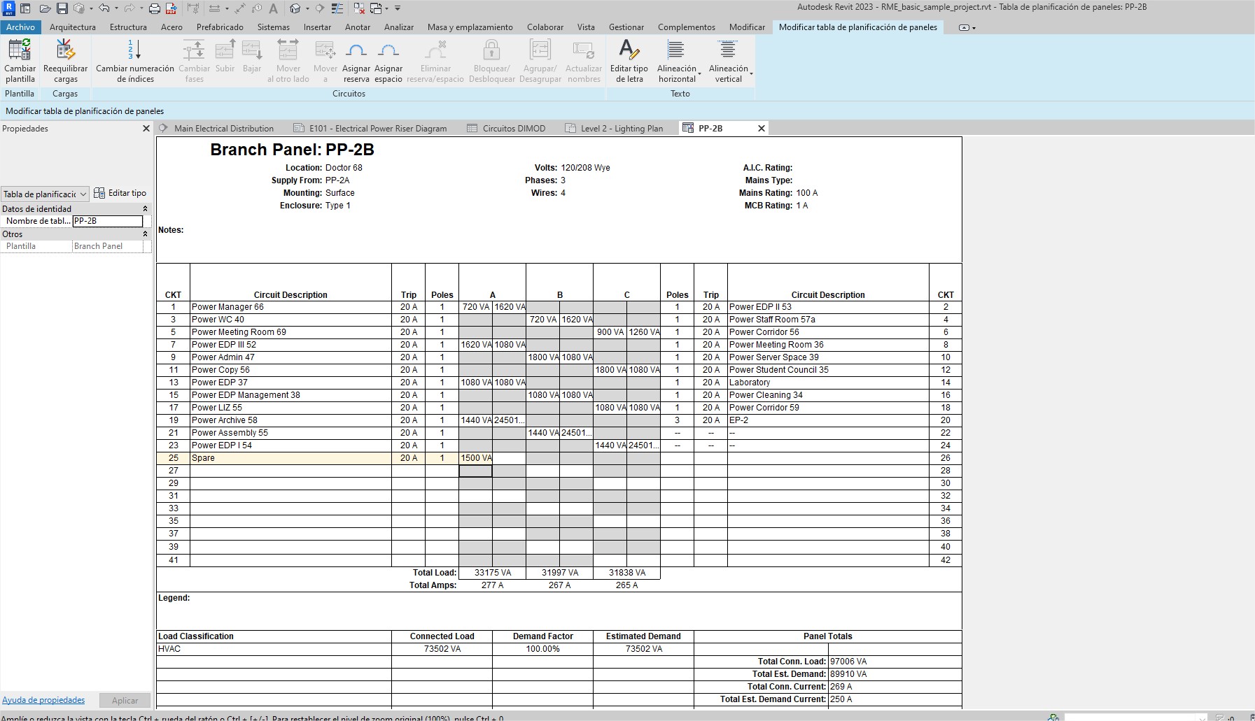 2. Circuitos de reserva: Circuitos de reserva añadidos en el panel de Revit.