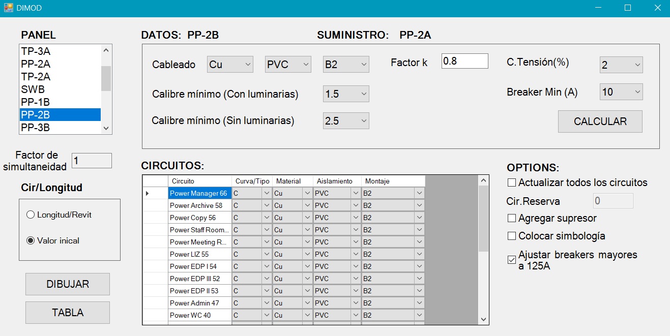 En la ventana del complemento, el usuario puede seleccionar un panel de la lista y los circuitos se mostrarán en la tabla. Todos los cambios se realizarán en ella, excepto el valor numérico, que debe modificarse en la programación de los parámetros de datos.