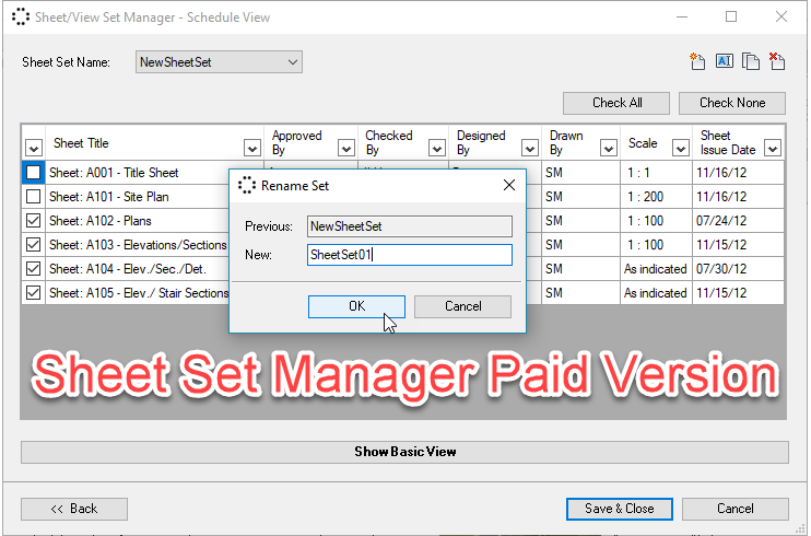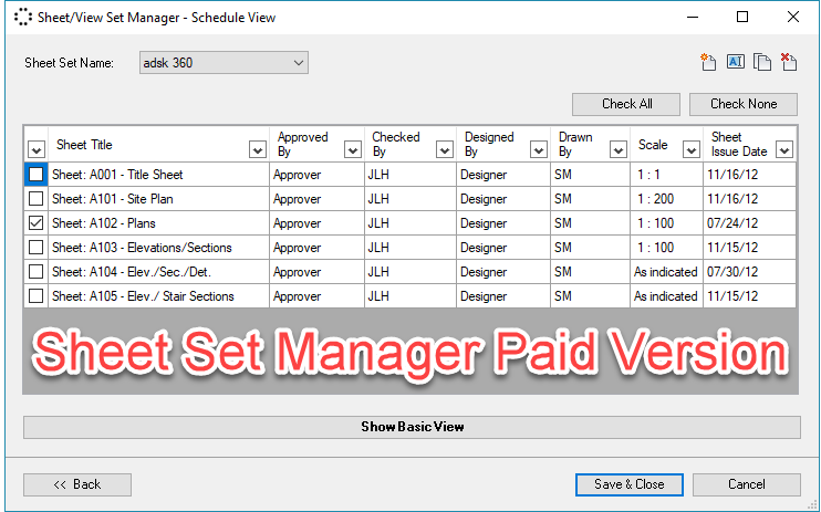 The paid version is also available and in this version, the schedule view in more practical and you could manage your sheet sets by using a table and filtering sheets based on their parameters. So you could edit, rename, duplicate, or delete sheet sets, or create new ones easily by using the mentioned filtering feature.
