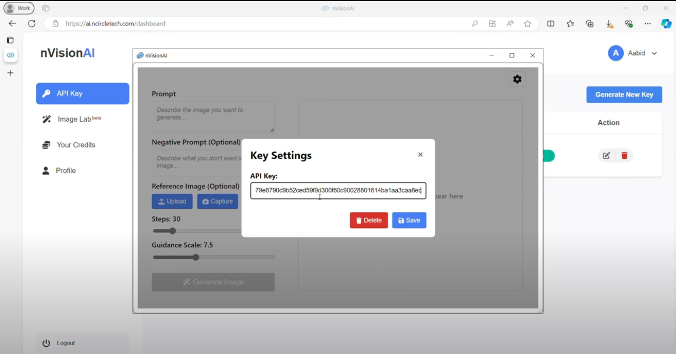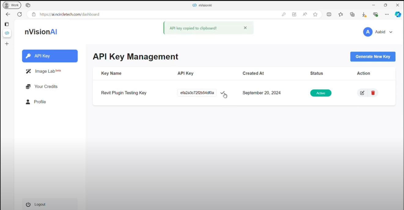 2.User will have to click on "Generate New Key" button present on dashboard.Access key will be generated.