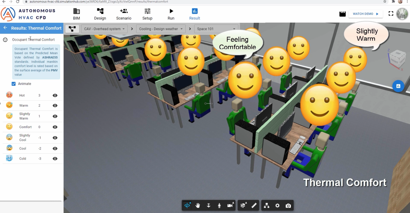 AHC is a cloud-based CFD SaaS product that generates accurate CFD results without any CFD inputs asked from the user. CFD model is built automatically while creating the BIM configuration using an in-build BIM designer. Users can define design configurations and scenarios and quickly do a design exploration to estimate thermal comfort for each situation. The product is validated against many test cases.