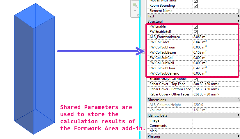After you create a structural BIM model in Revit, this add-in will help you calculate the formwork area for each member and save the calculated values in Shared Parameters.