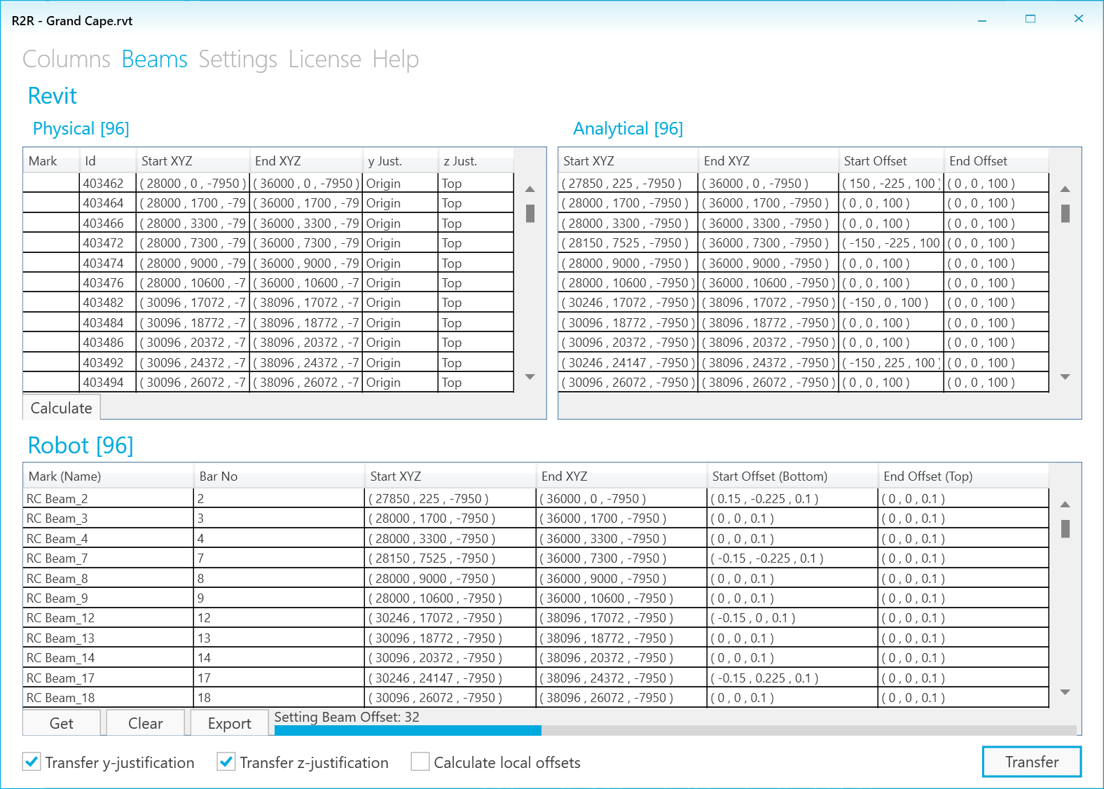 - Automated Offset Calculation: R2R identifies the discrepancies between physical and analytical elements (structural beams and columns) and calculates the offsets automatically.