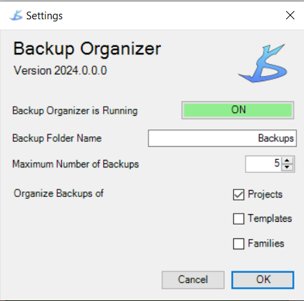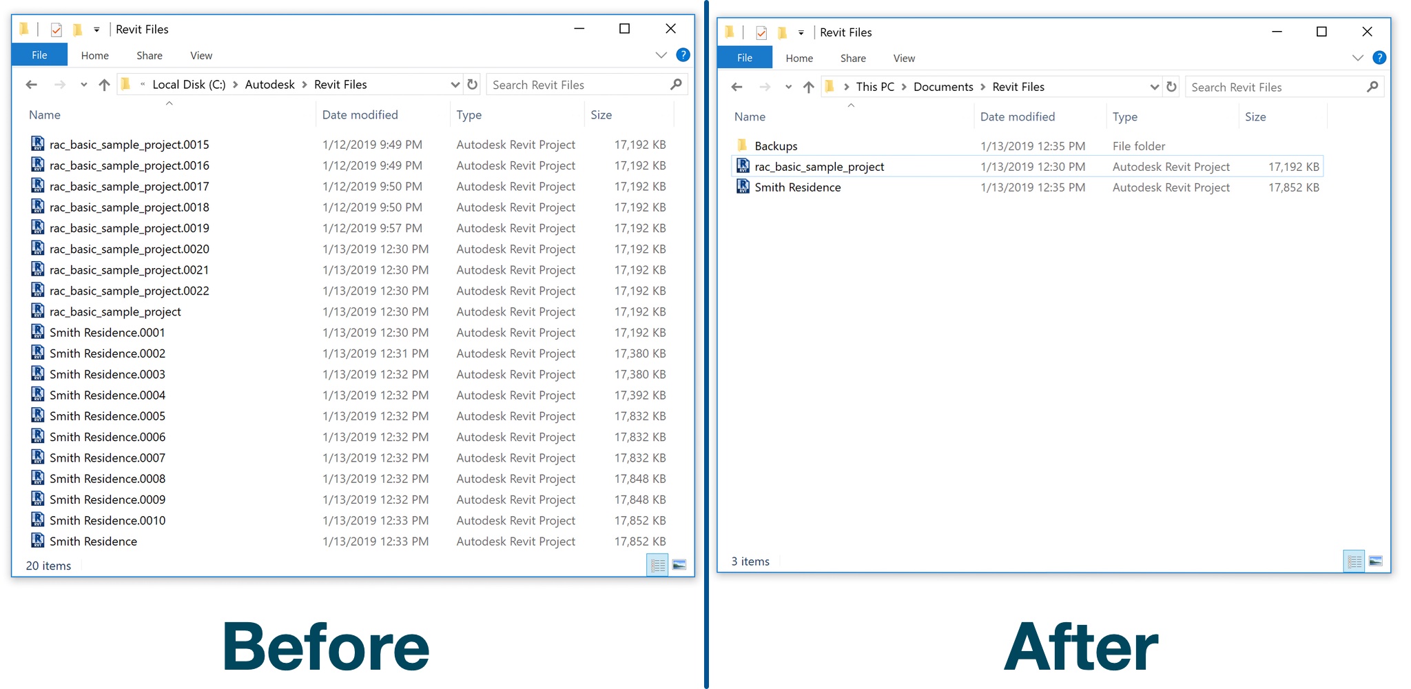 With this add-in installed, each time a backup file is created by Autodesk® Revit® it is automatically moved into a Backups folder in the same directory.
