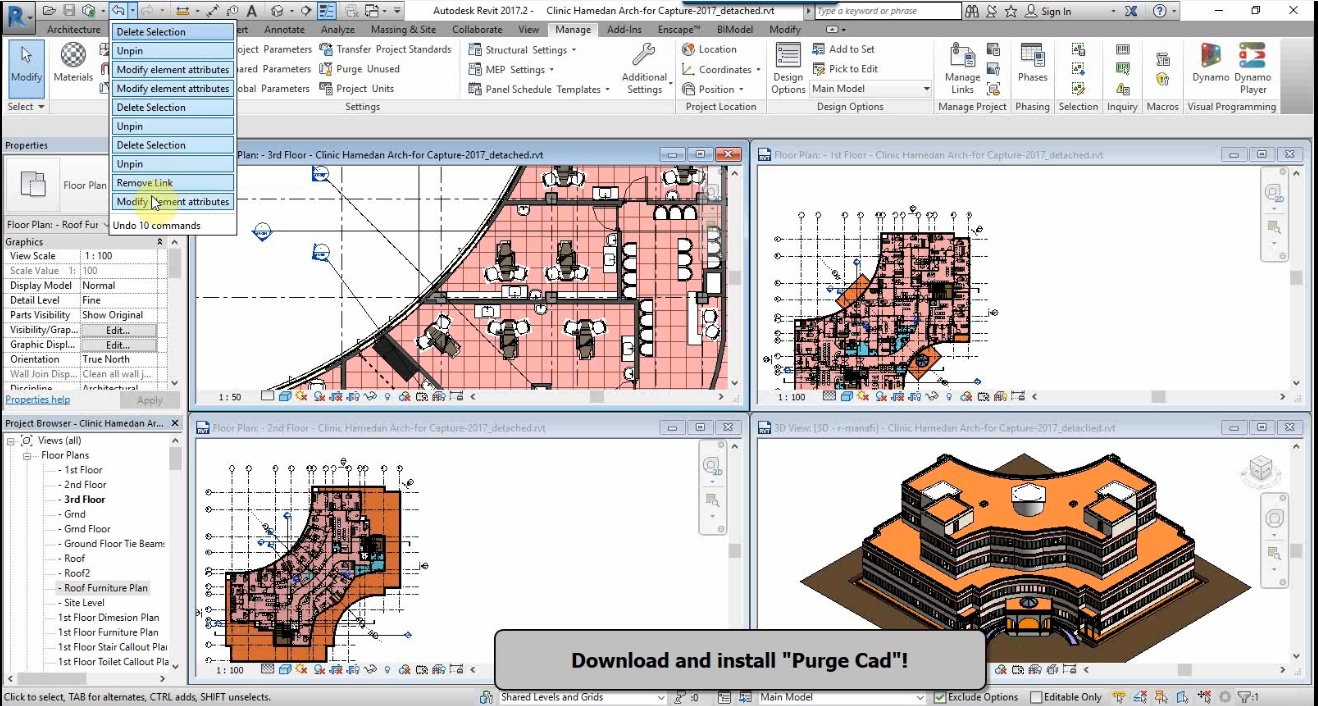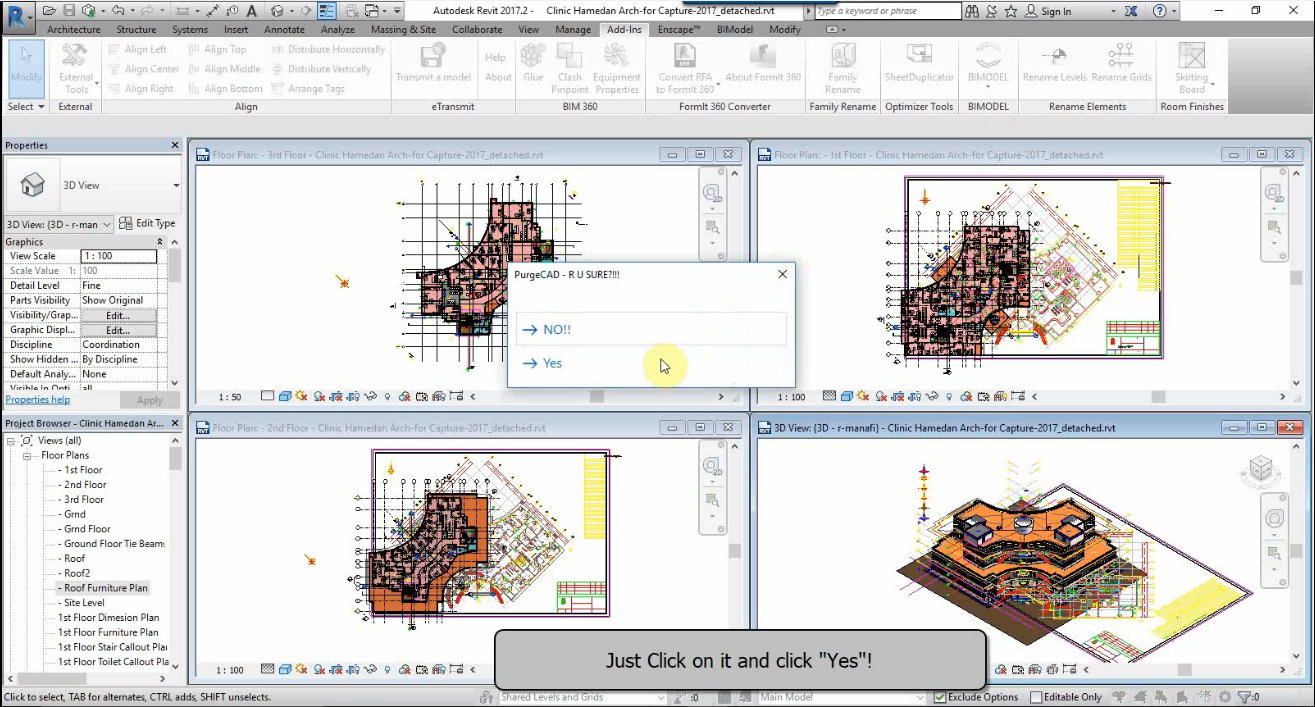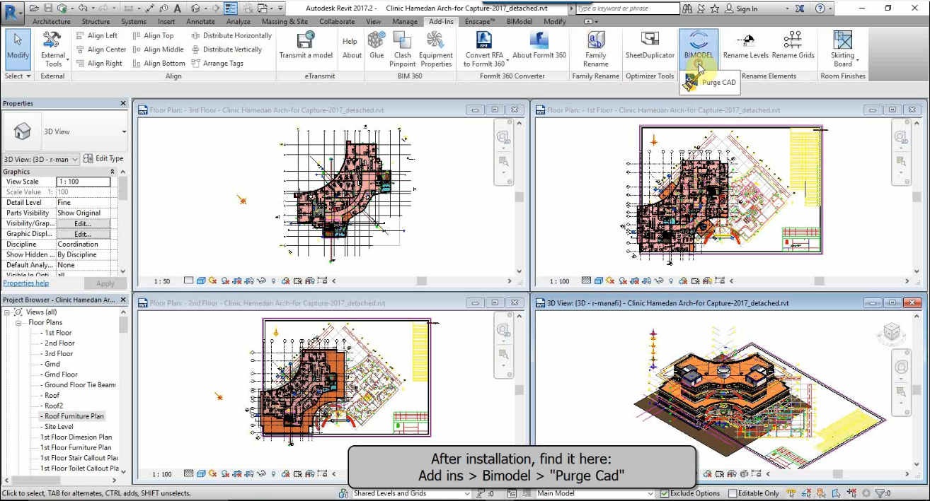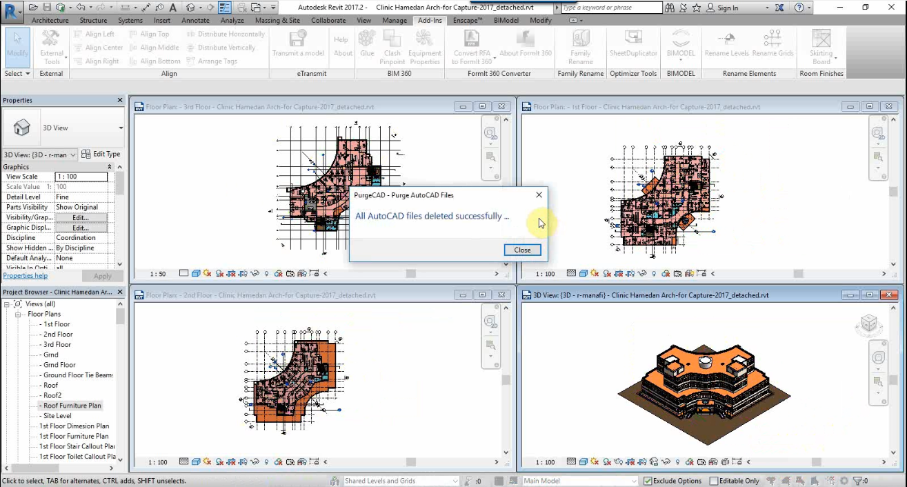 When your project is at the final stage and you want to purge all the linked or imported AutoCAD files, just click on the Purge CAD icon in our plugin and then Voila! All your linked or imported CAD files will be deleted whether they were pinned to your view or not and your project is clean from all the AutoCAD files.