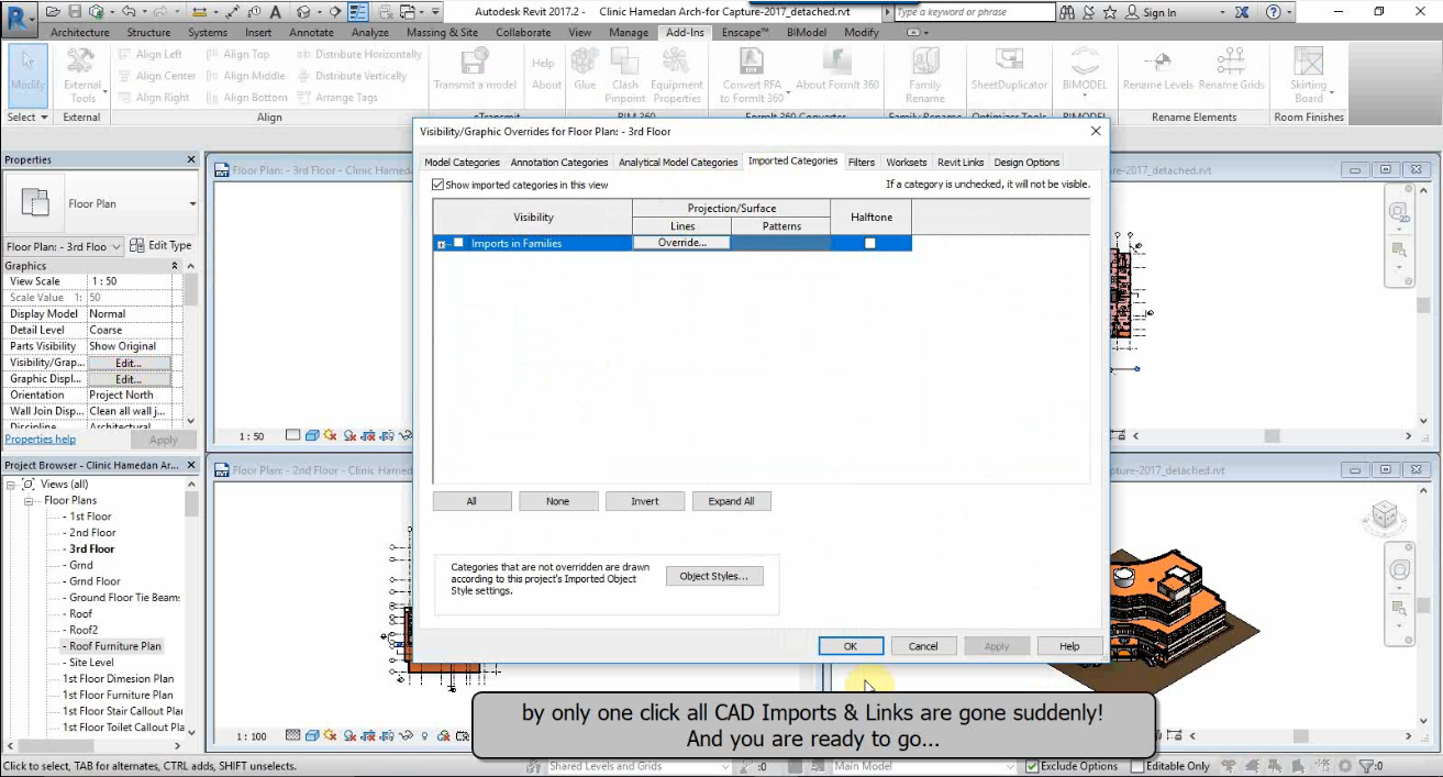 Removing Autodesk® AutoCAD® imports from an Autodesk® Revit® file is a frustrating procedure. Whether these files are imported or linked, you must use different methods to remove them and if they are pinned or embedded in the model you have more works to do.
