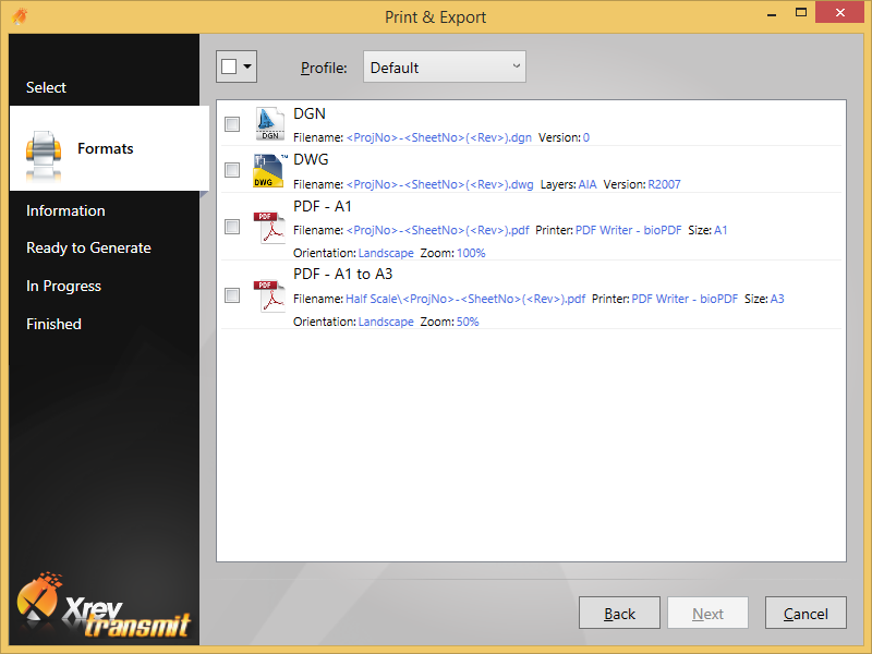Export & Print Multiple formats at the same time, including DWF, DWFx, DGN, DWG, DXF, PDF, RVT & as many hard copy printers as you like.